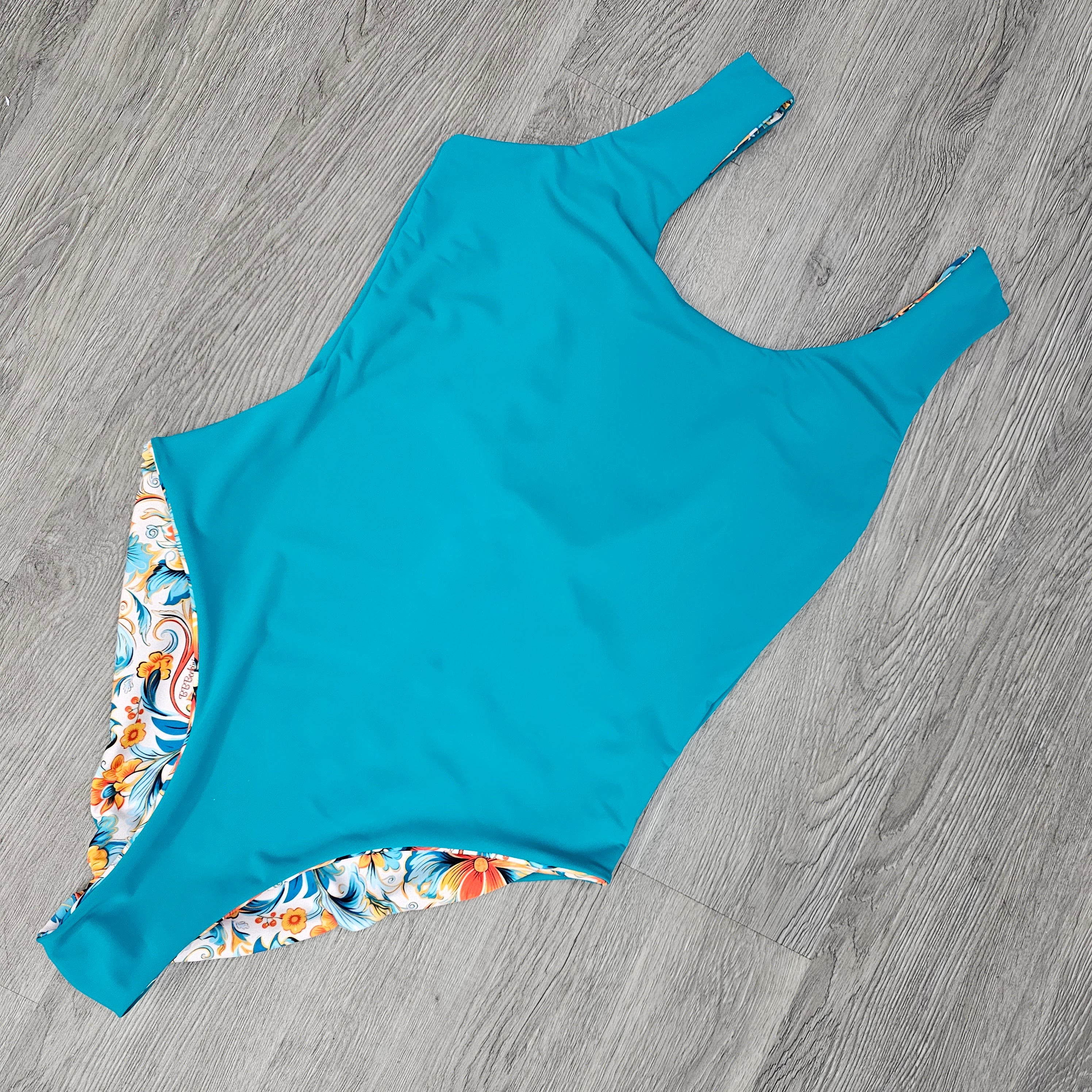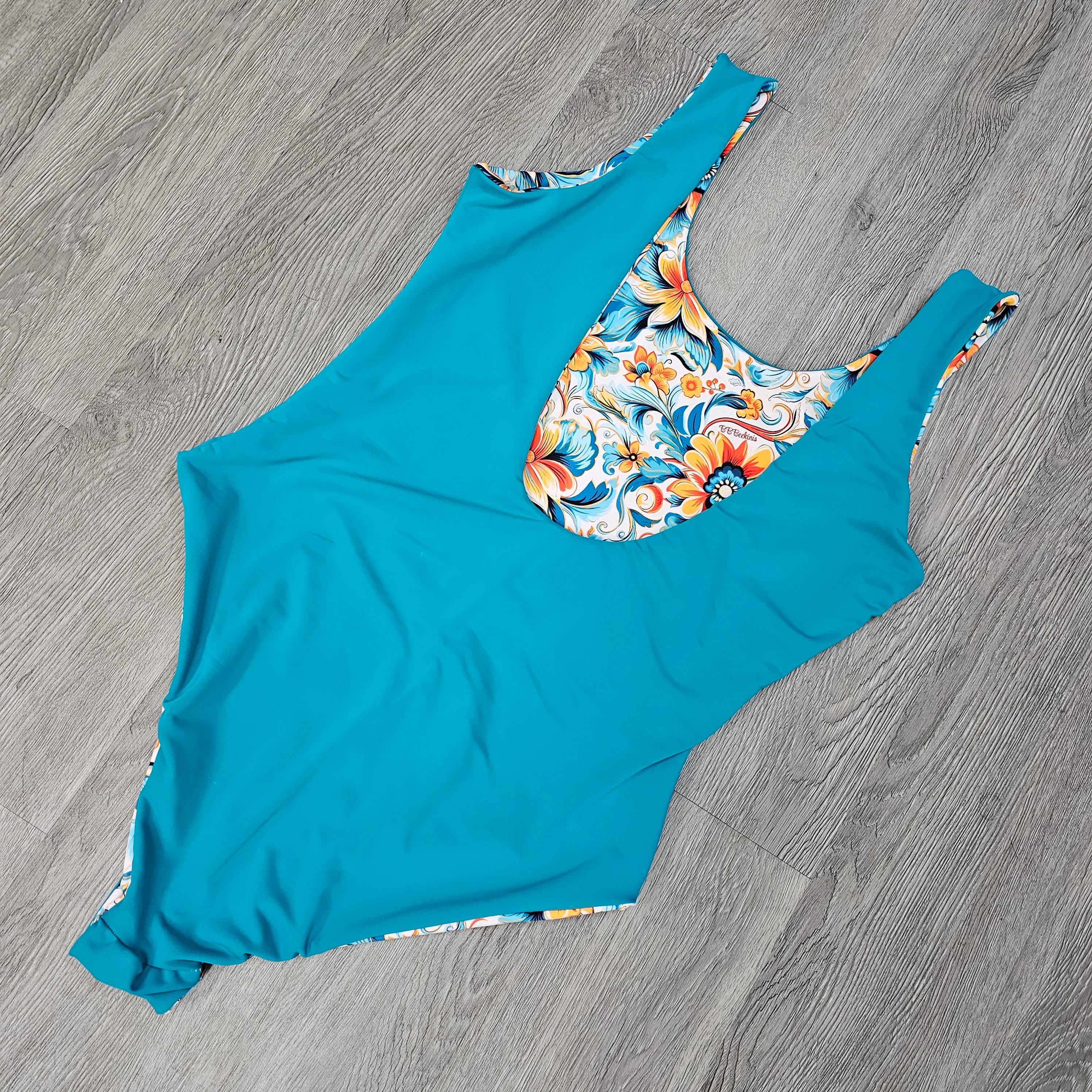 Be the queen of the beach in this one-of-a-kind Adobe Cielo Ocean One Piece! You'll make a splash with the beautiful and unique Adobe Cielo print and eye-catching blue Ocean reverse. Make waves with this truly original, exclusive style – only one avail!