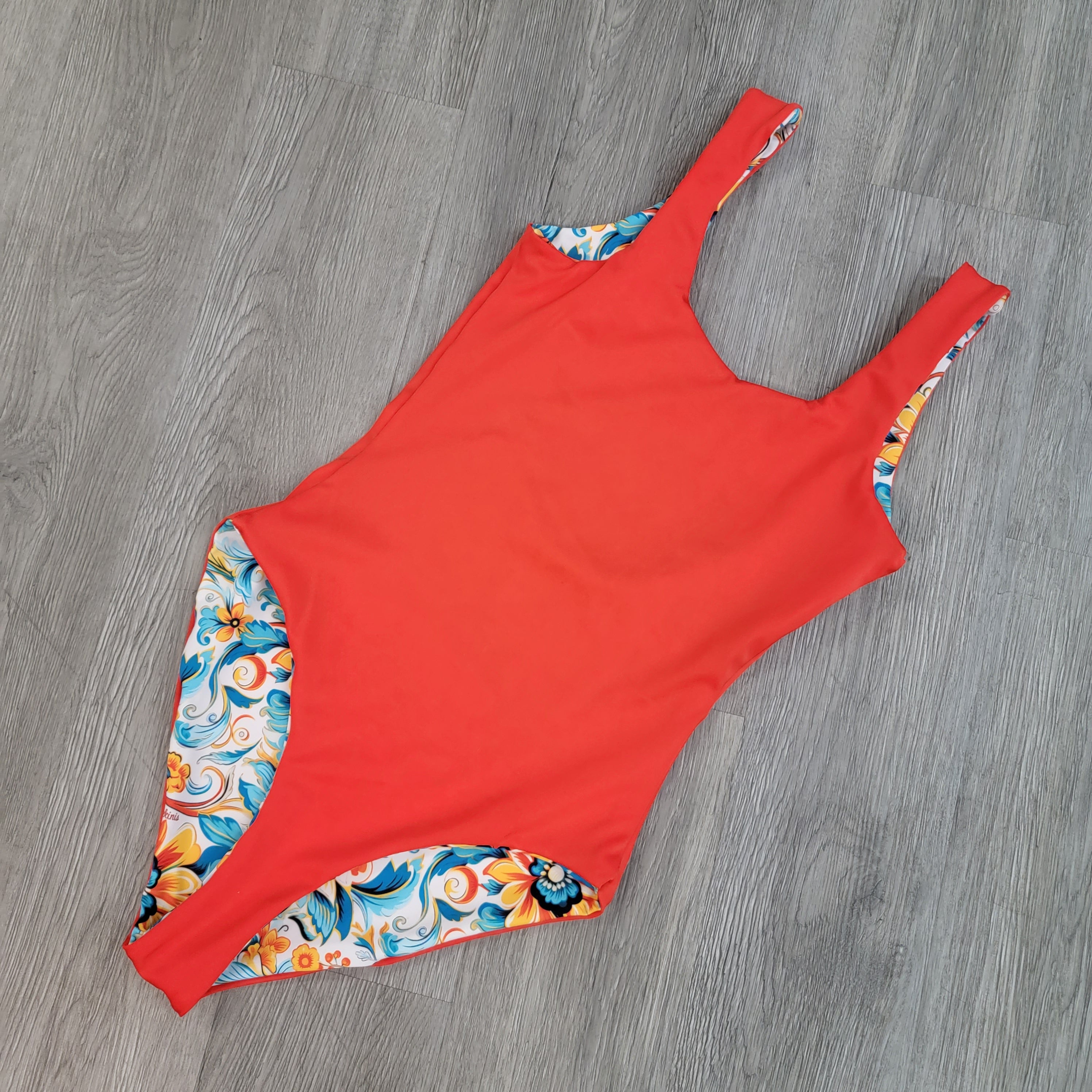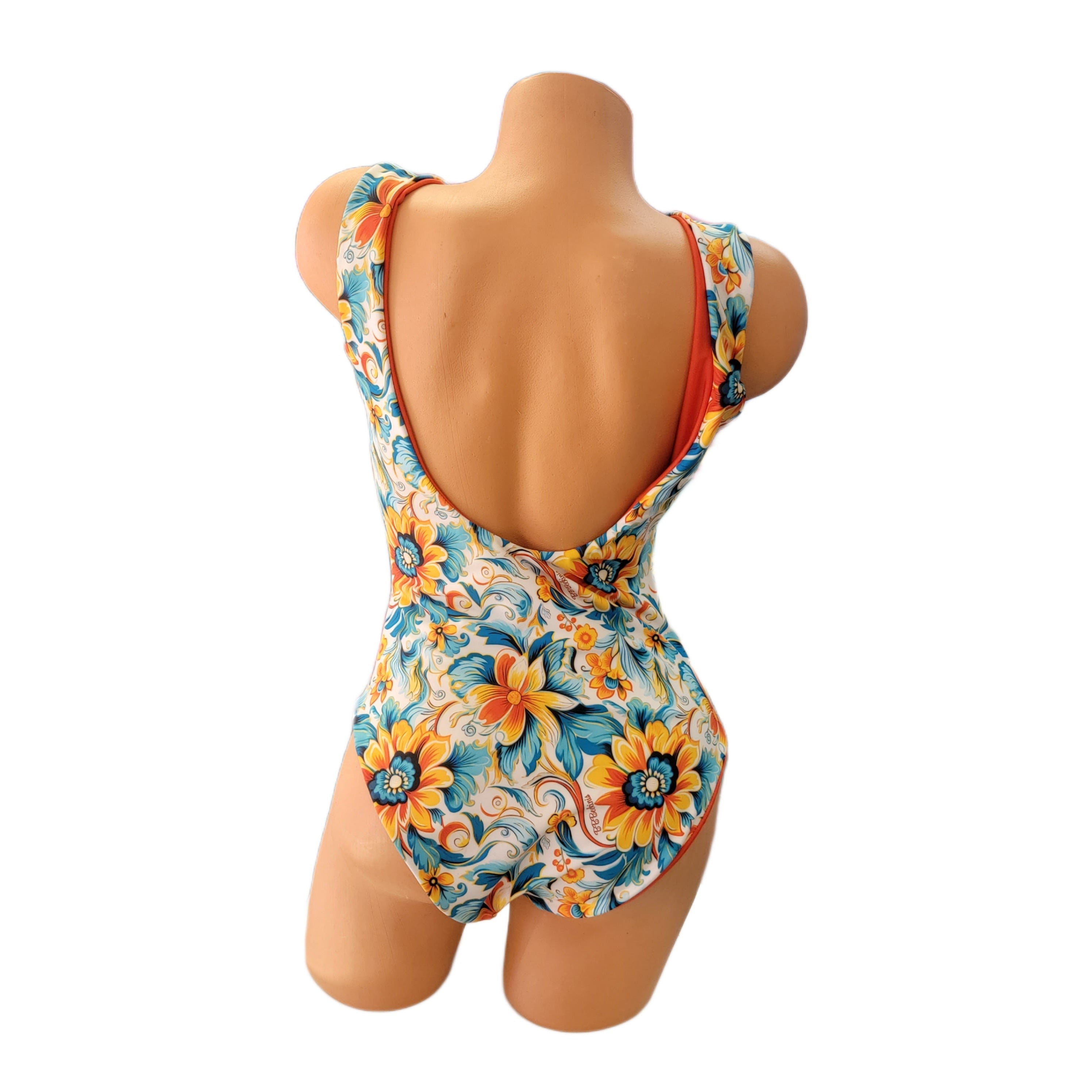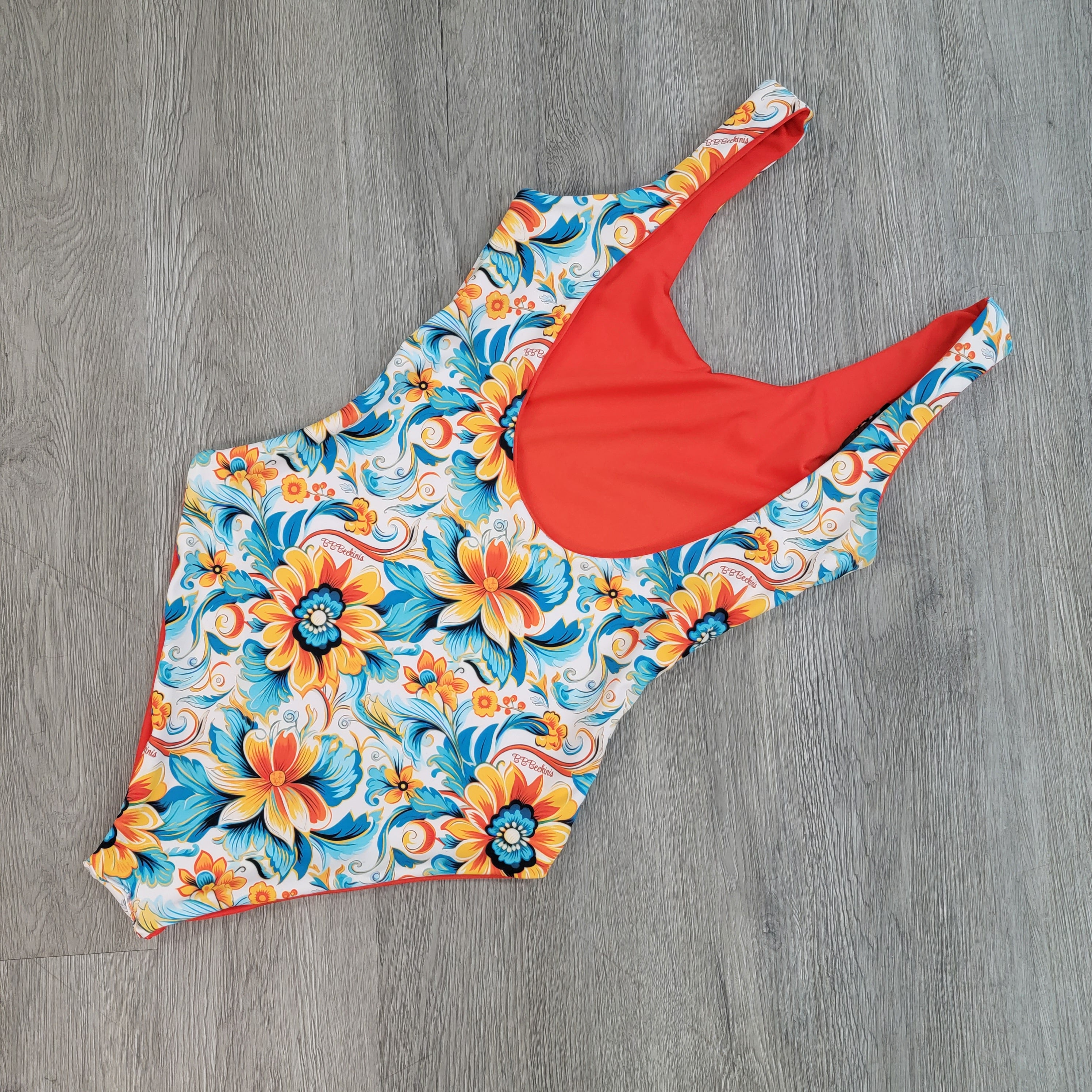 This Adobe Cielo One Piece is sure to turn up the heat! Feel beautiful and sexy in flattering coverage and a plunging backline. Show off your wild side with vibrant blue and yellow florals or switch it up with the hot coral reverse. Whichever you choose, you're sure to look hot, hot, hot!