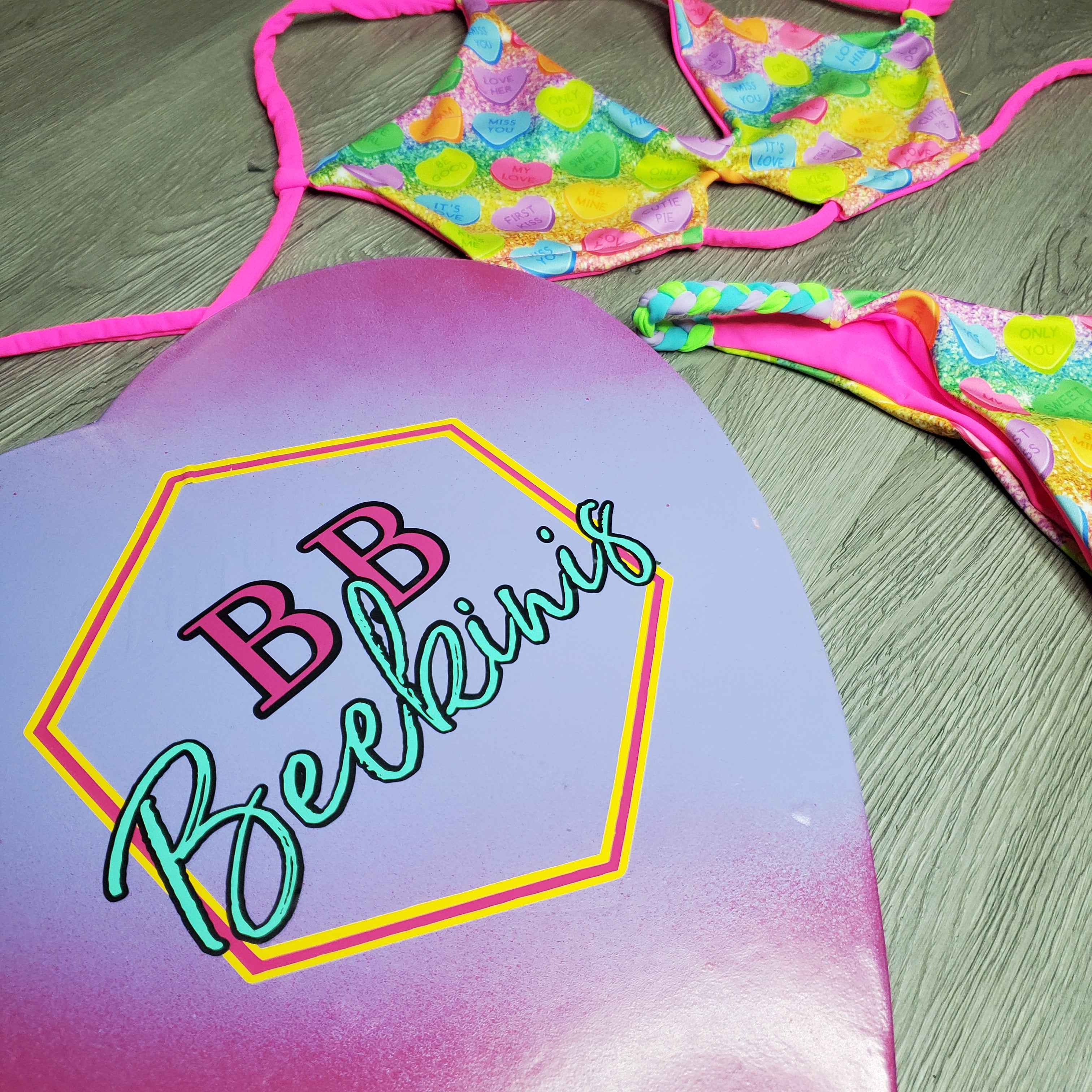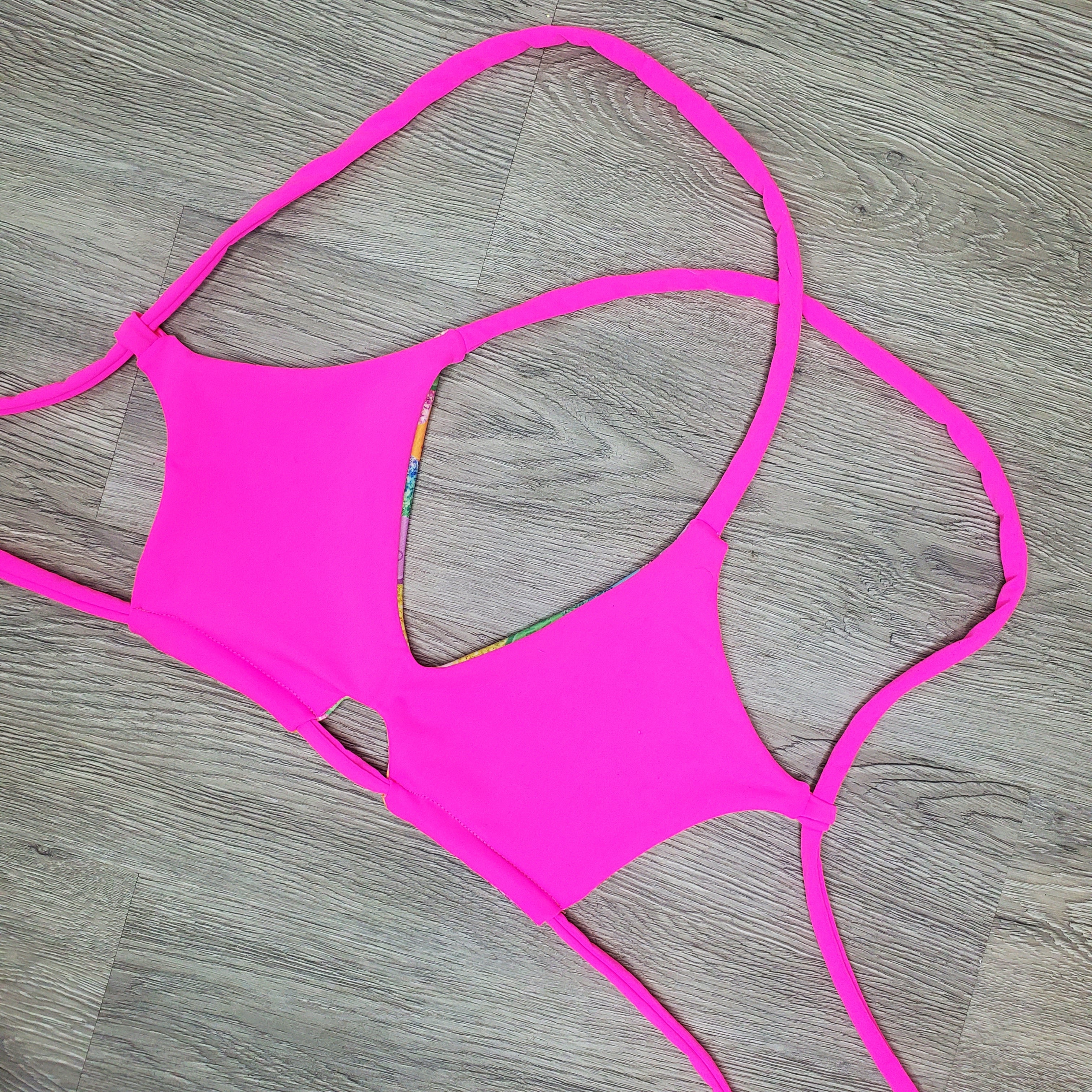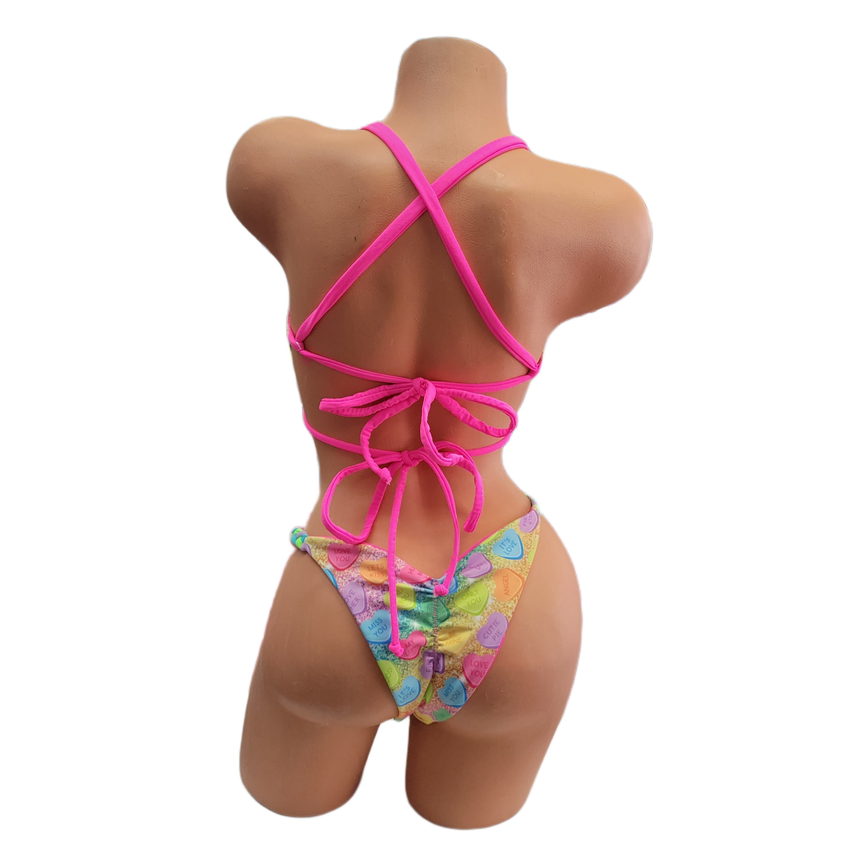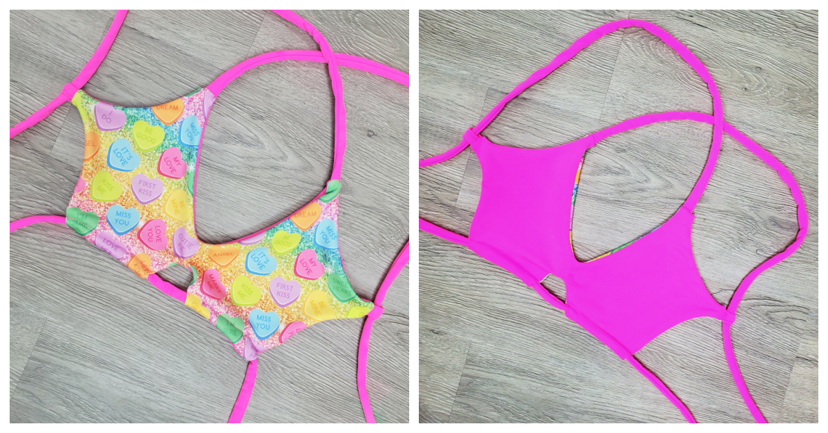 A Classic Candy Heart designed fabric with faux glitter print reversible to a neon pink. This top is a peek-a-boo top with cleavage revealing cut outs. Two back straps, one that crosses and one under bust for support.