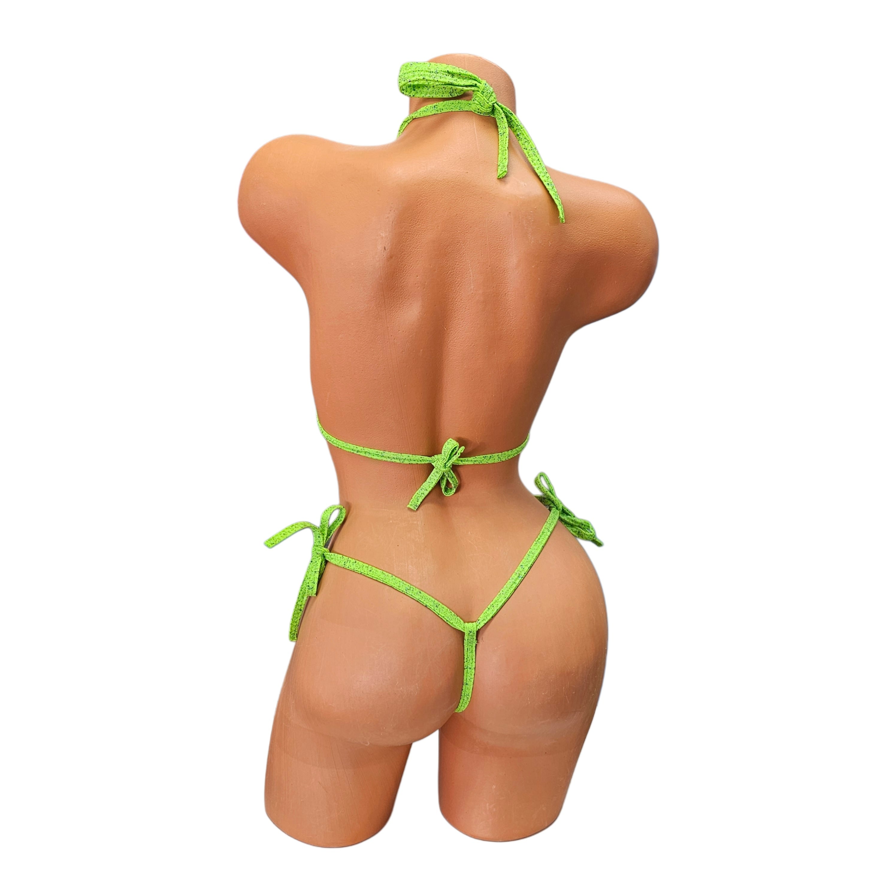 Get ready to turn heads in our Lime Sparkle bikini! The 4 way stretch spandex hugs your curves, while the foil print adds a pop of color. Perfect for those hot days, the tie sides allow for a customizable fit. Strike a sultry pose in this unique swimsuit!