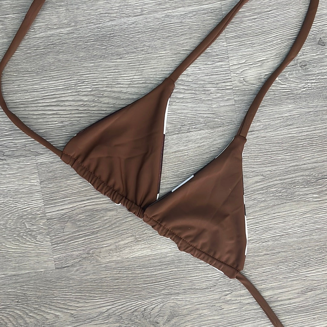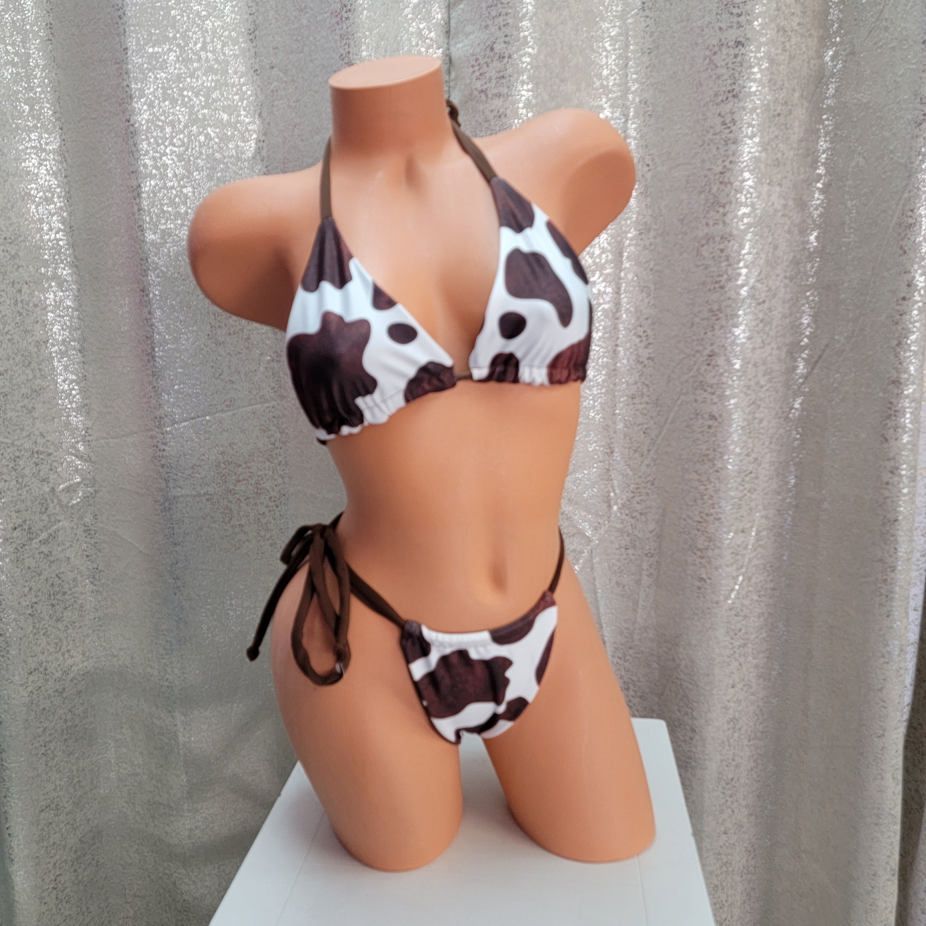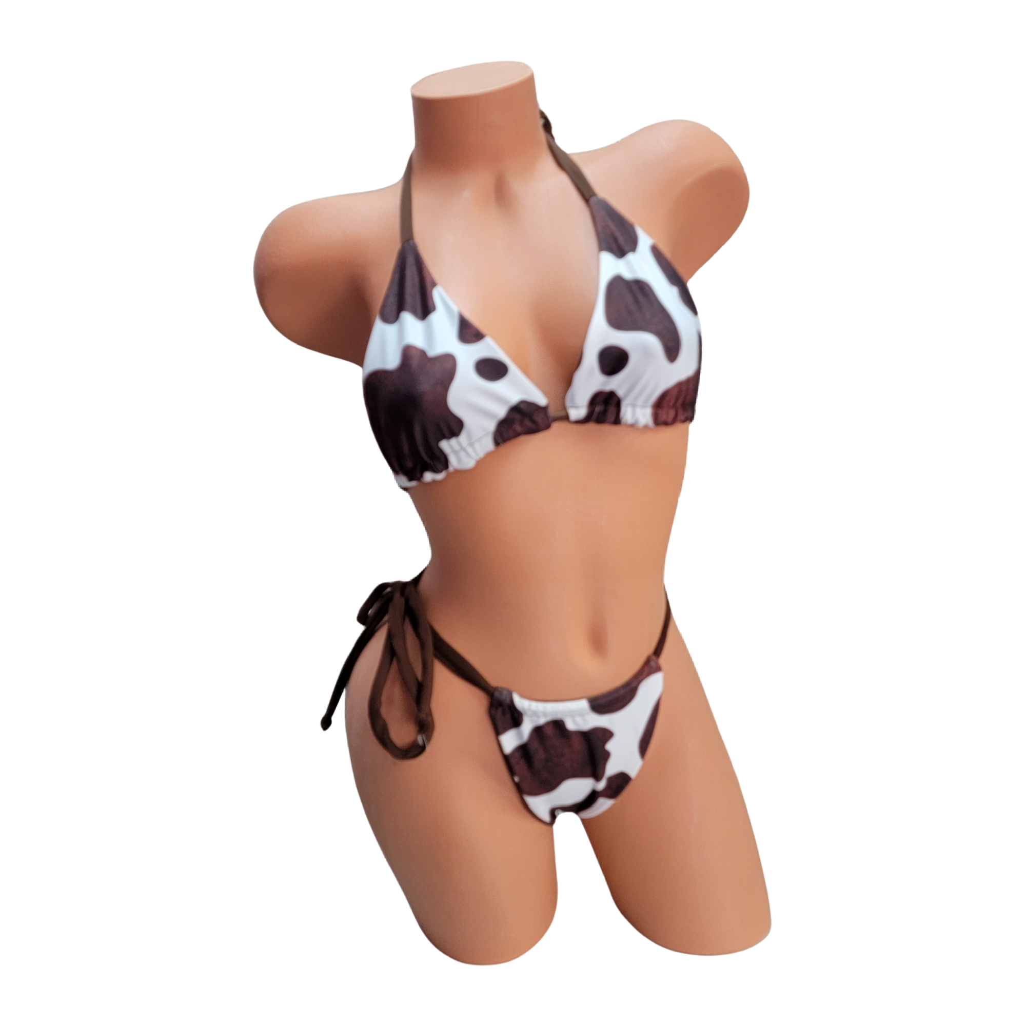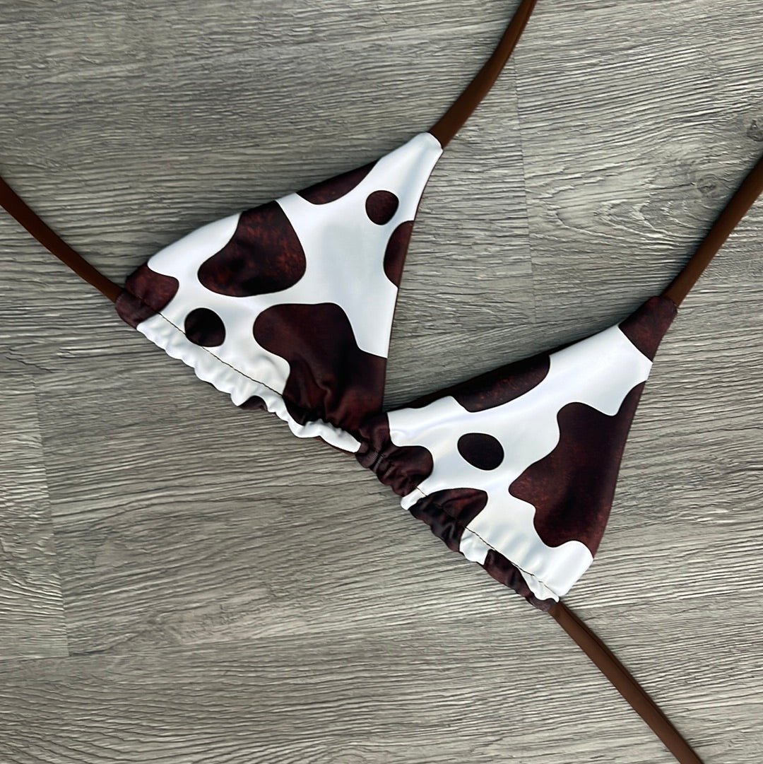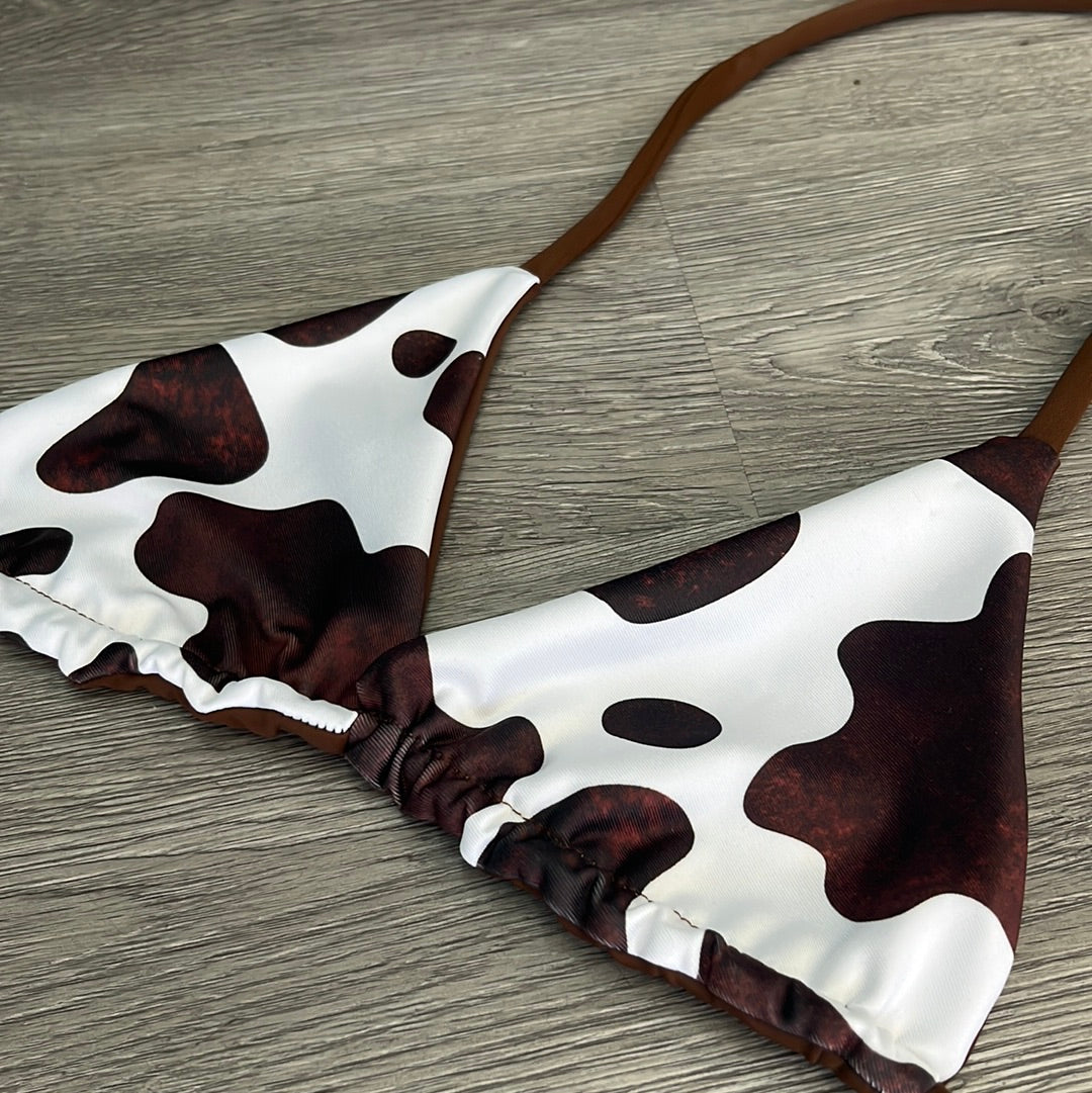 Make your wardrobe MOO-ve in the right direction with this Milkshake Triangle Top! Featuring a fun cow print and solid brown color, it's the perfect combo of comfort and style. With its reversible design and adjustable straps, it'll leave you feeling udderly fabulous!