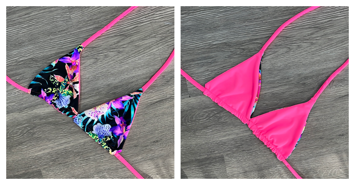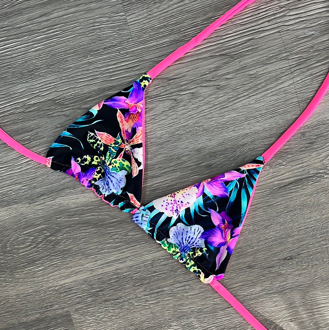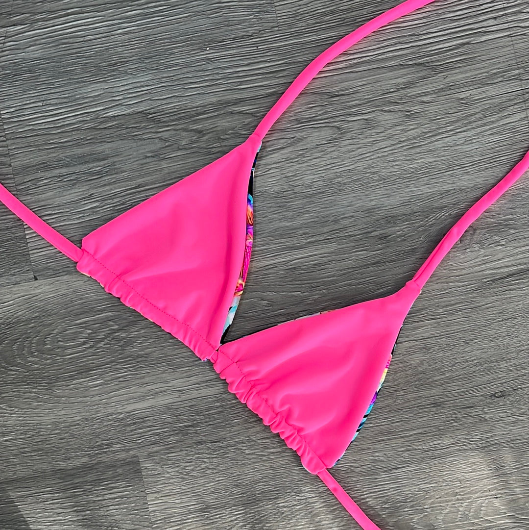 Next up on the beach, a daring pink triangle top that puts a smile on your face. The moonlit tropics is no run-of-the-mill triangle top; this exotic print will stand out in any setting. Tie neck and back make it easy to put on and take off.
