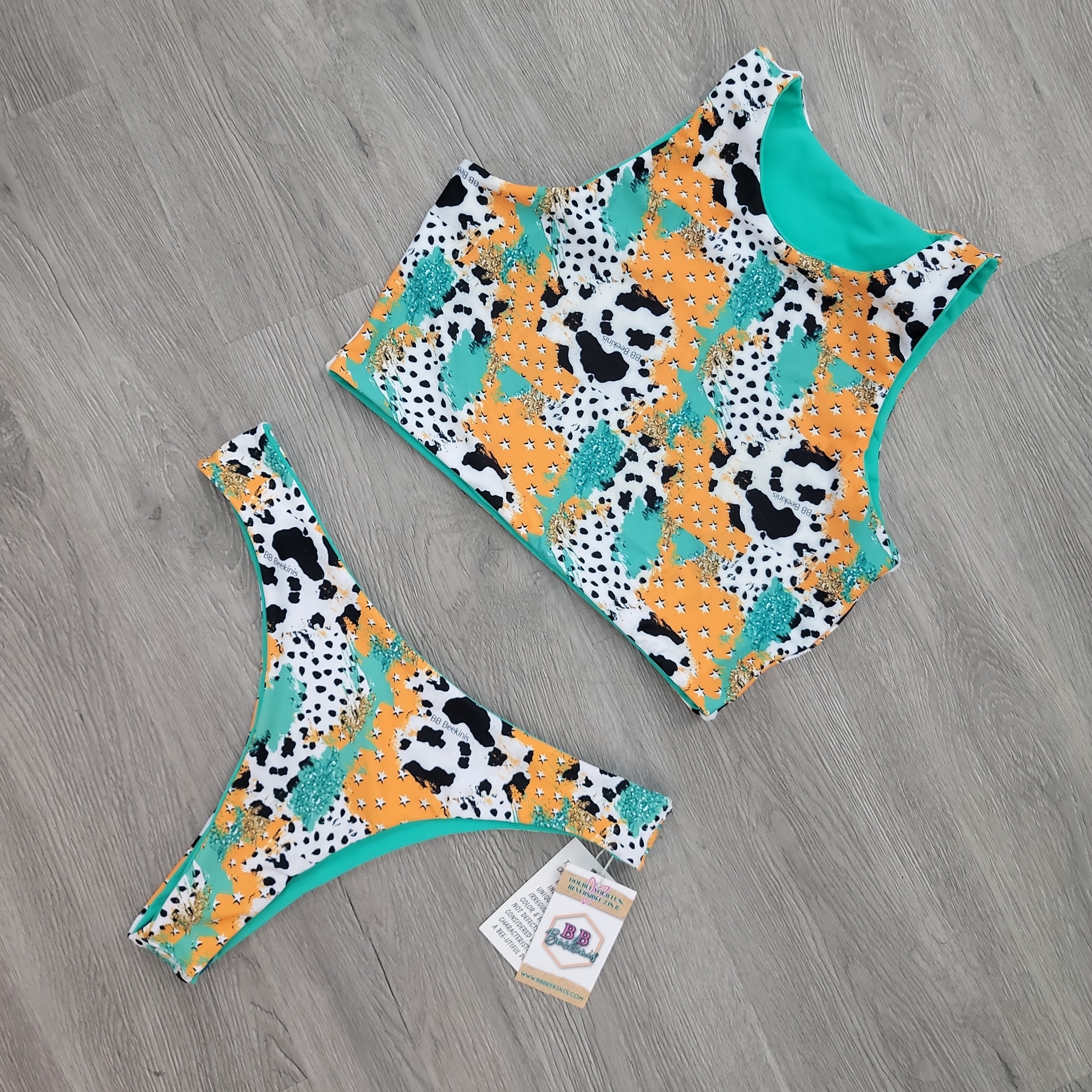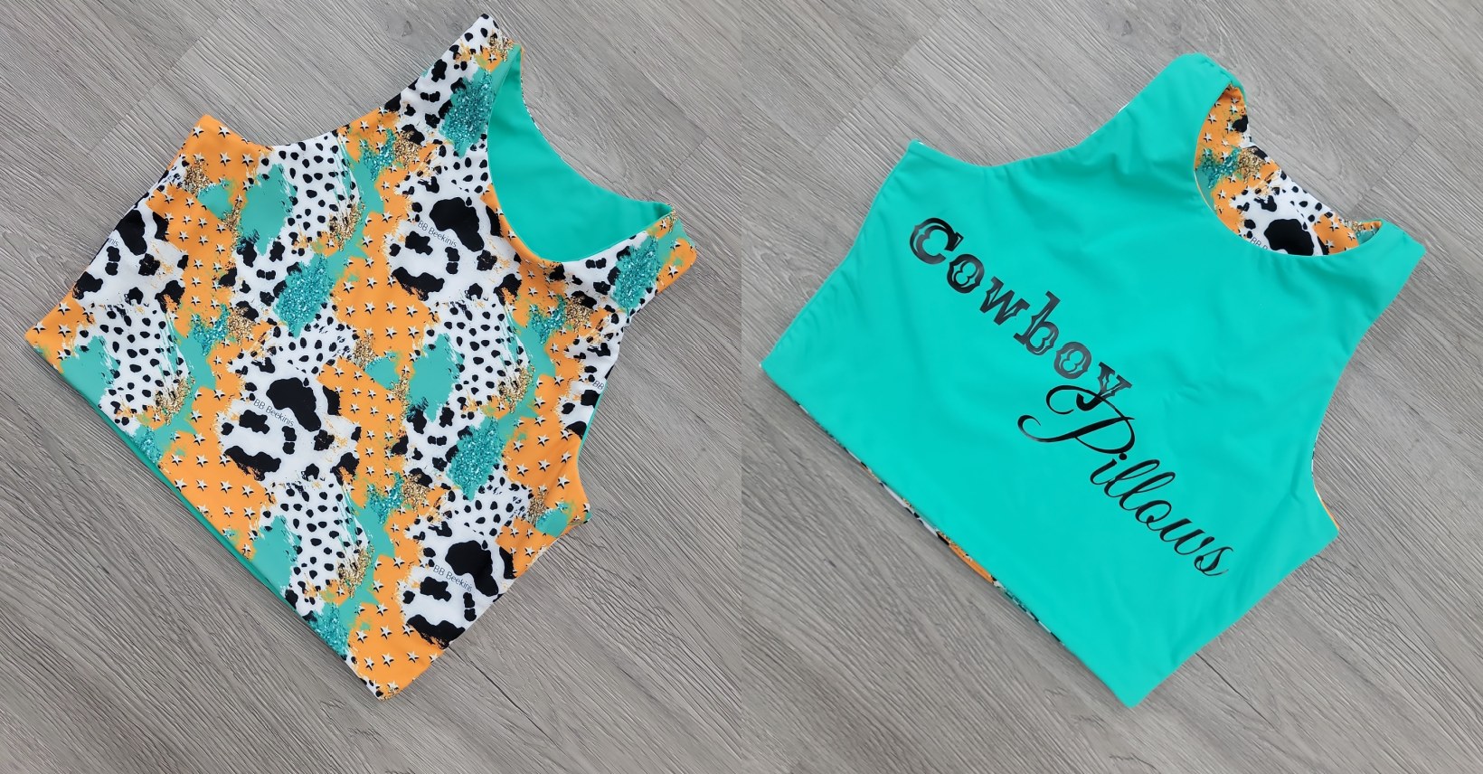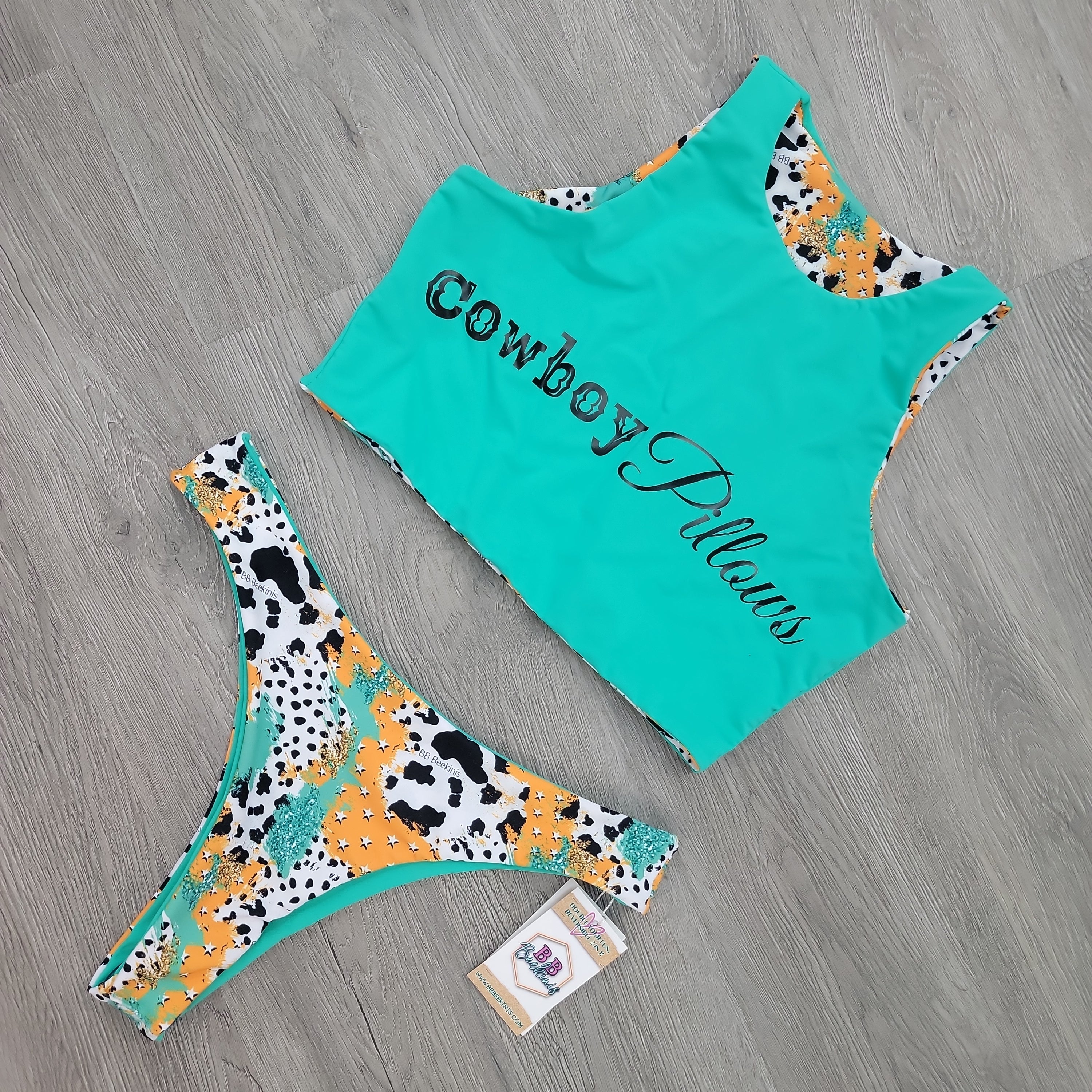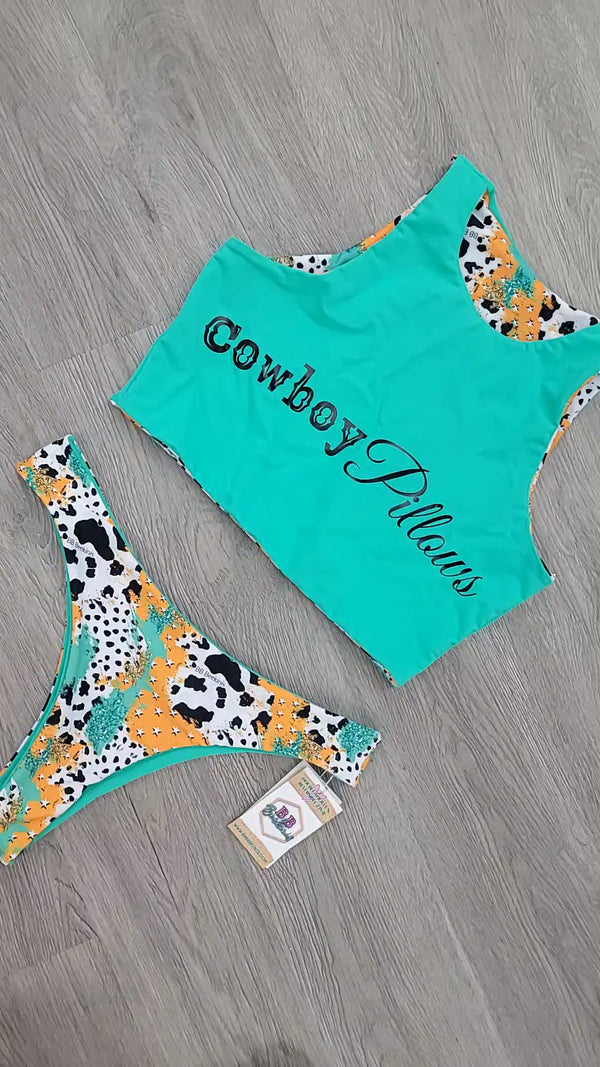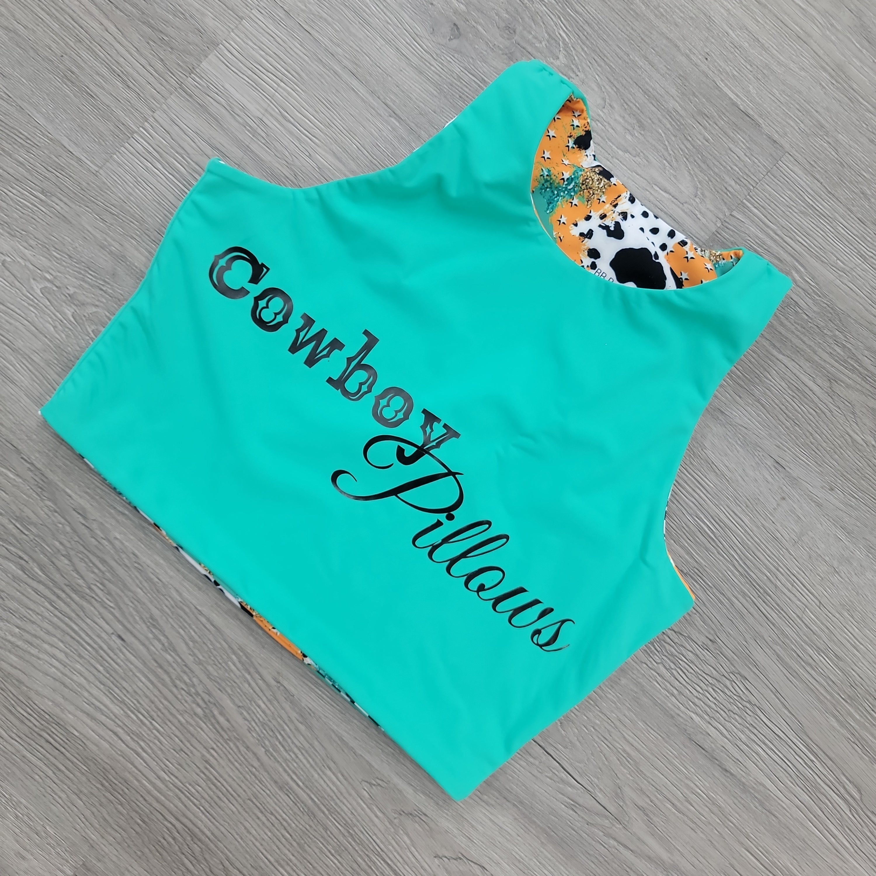Teal spandex is a hoot, reverse sides show Ol' Texas print with cow spots and sassy teal sparkles. Our "Cowboy Pillows" font. Thick straps, supportive top and just blissful comfort.