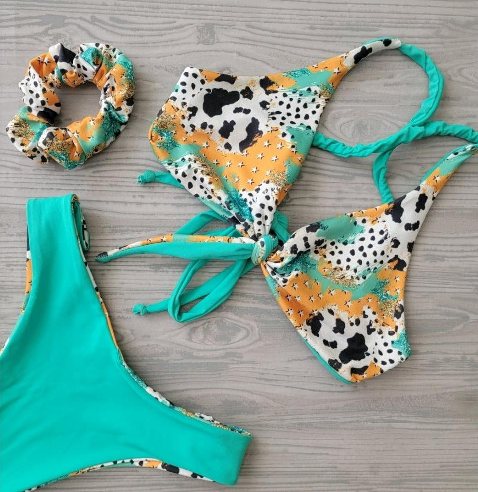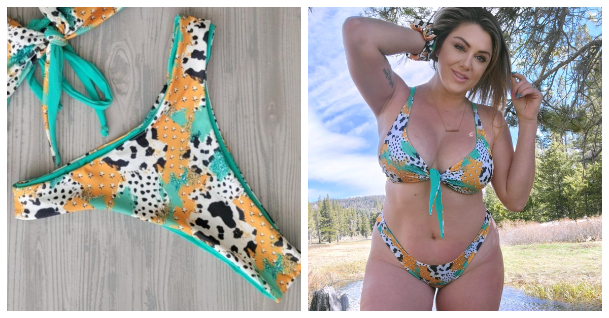 Our Country Bottoms are a must-have for any cowgirl or country queen! The reversibility adds more interest to this super cheeky bottom! Teal spandex reversible to western themed cow and star print. Rise is higher on the hip, thick side band. Super Cheeky bottoms.