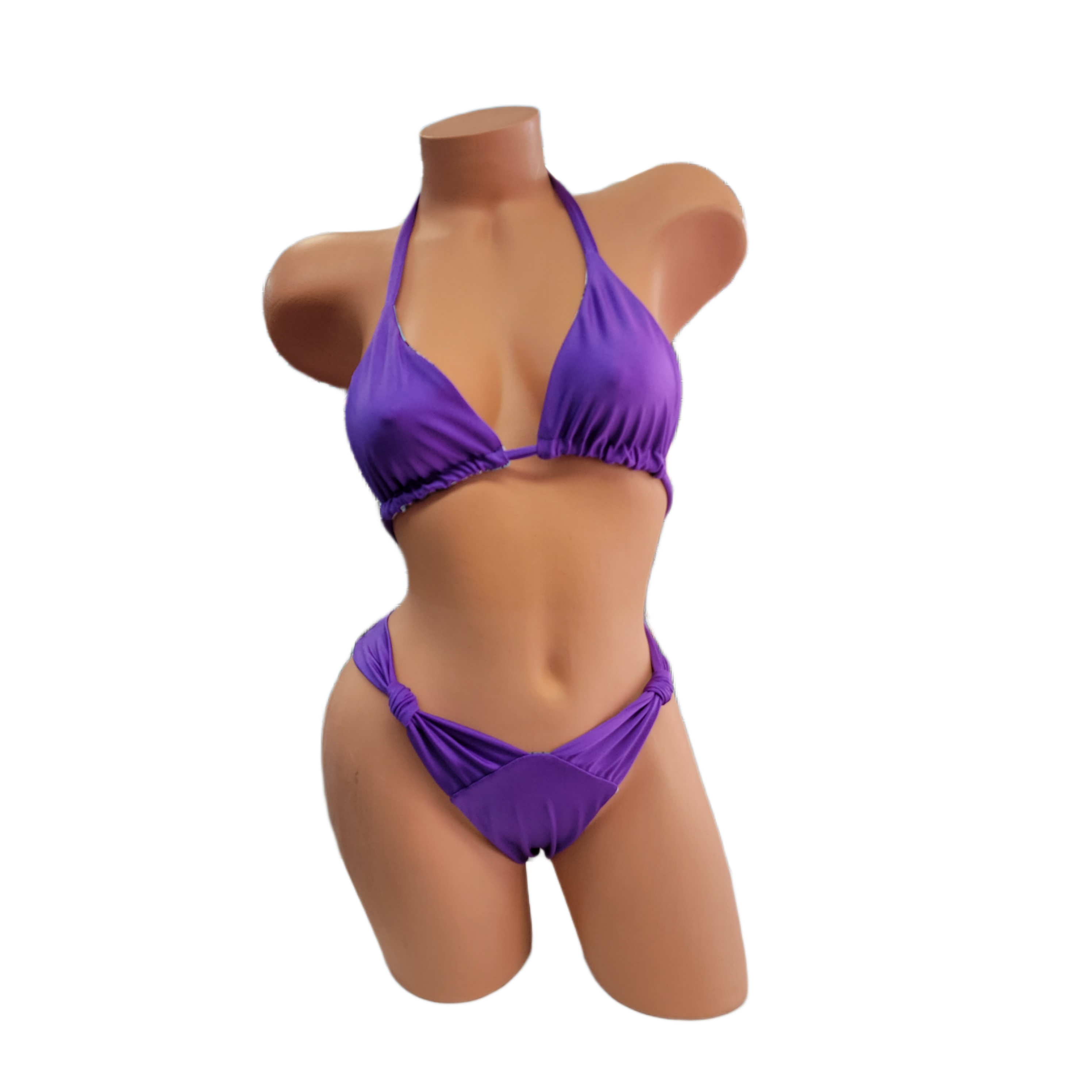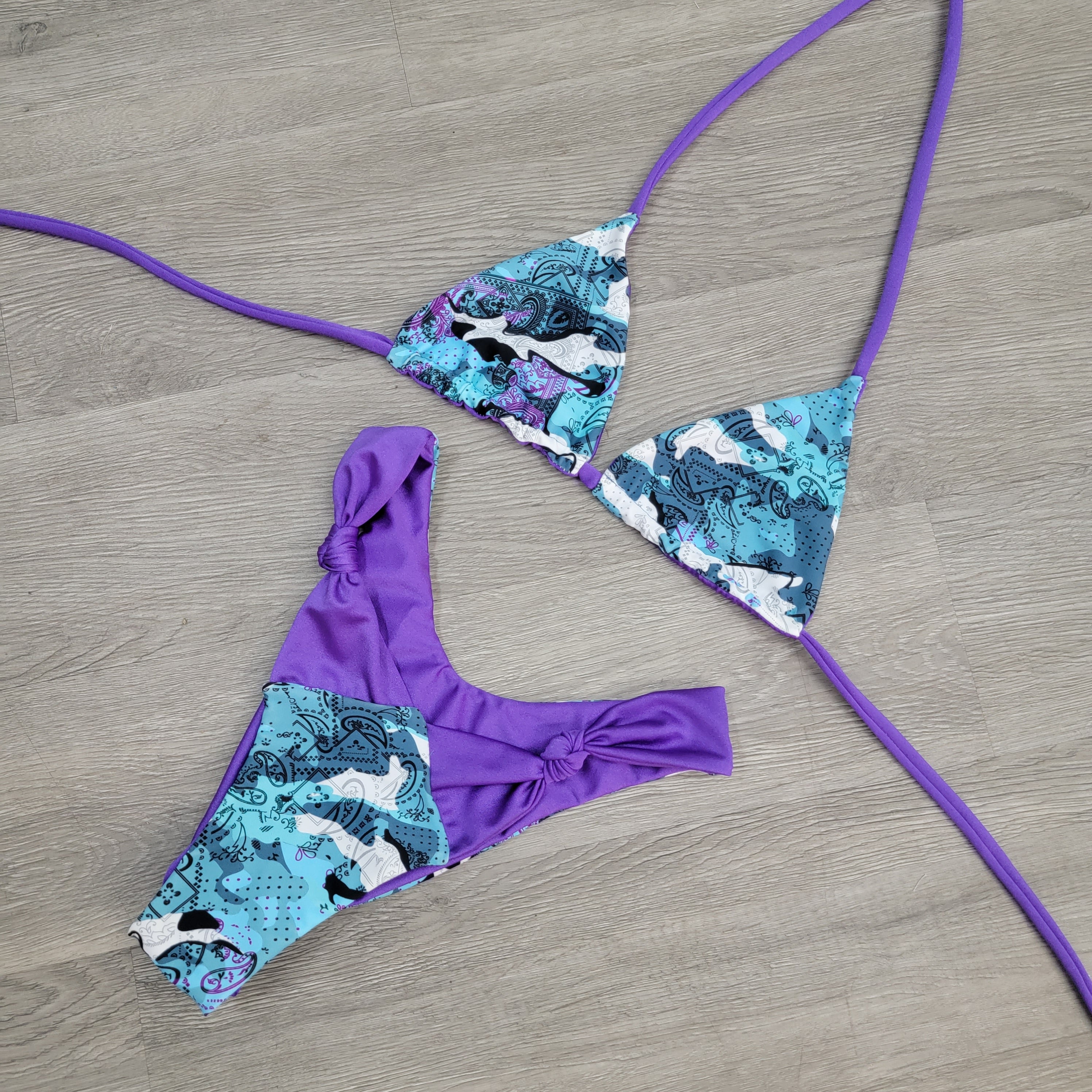 Get ready to make a statement with these Purple Paisley Knotty Bottoms. Featuring bold paisley prints in a playful camo-purple-blue design, these bottoms are both reversible and complete with a unique side-knot detail. Go ahead, be cheeky!