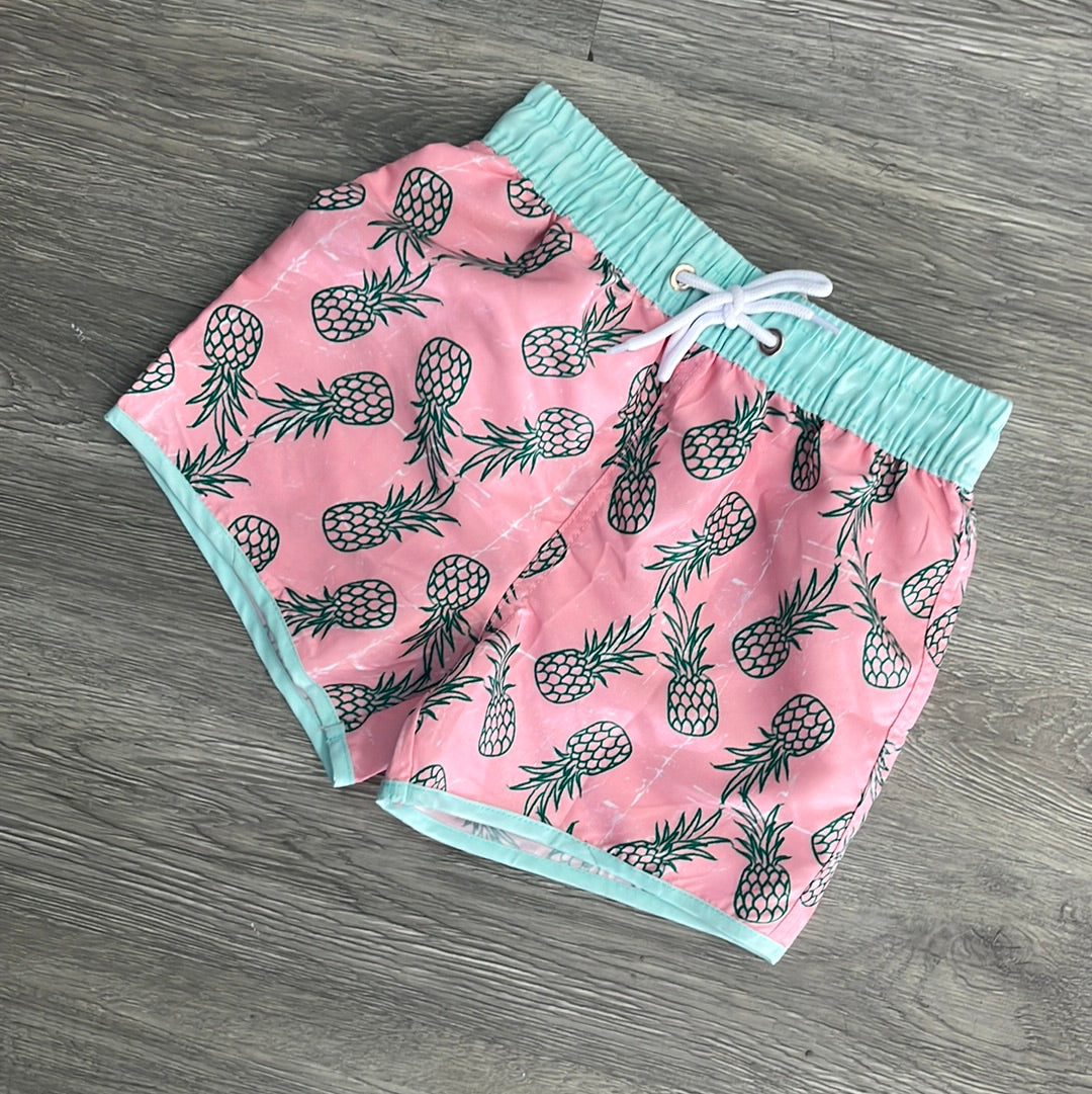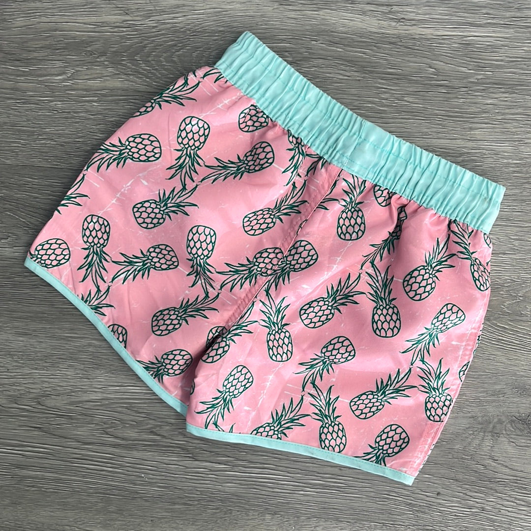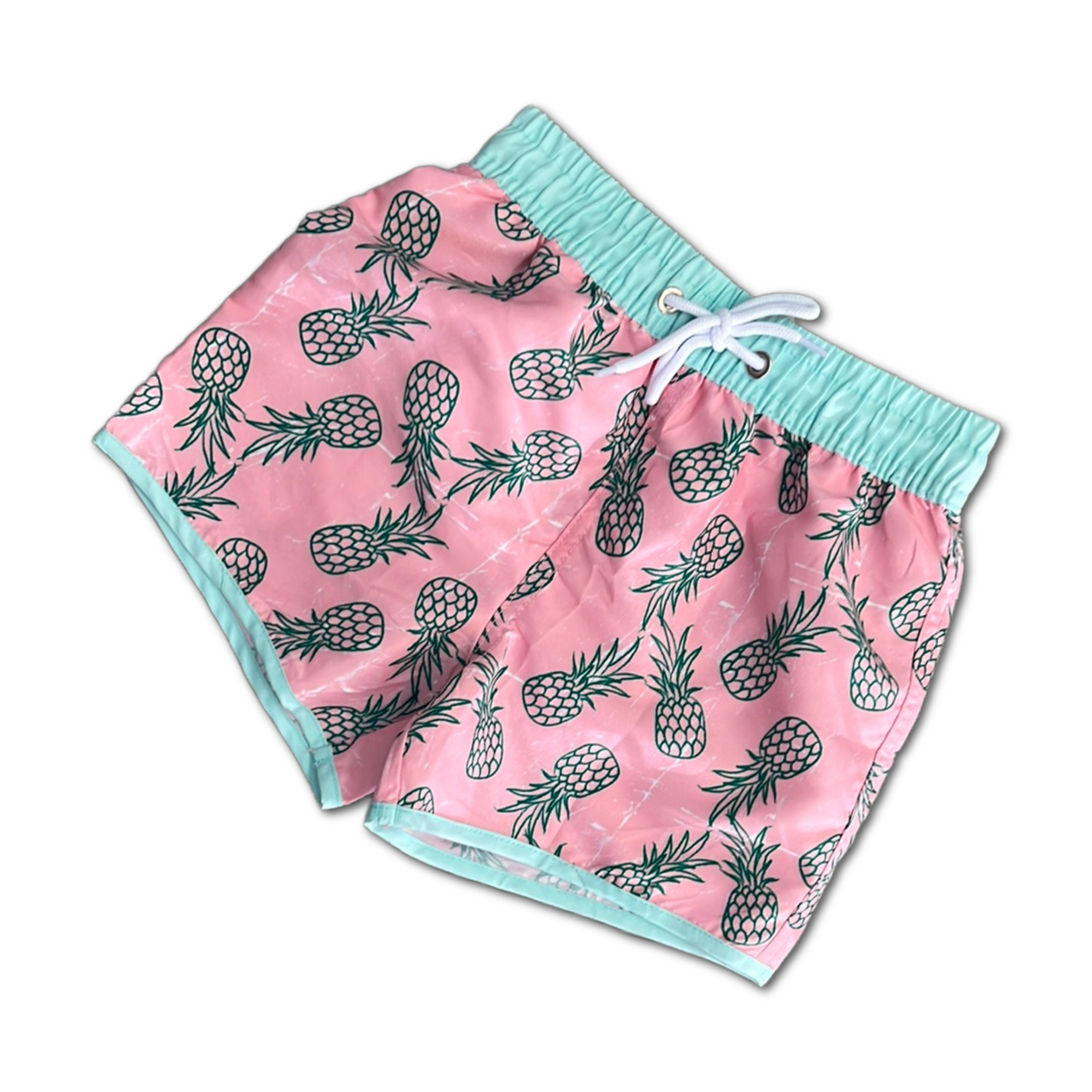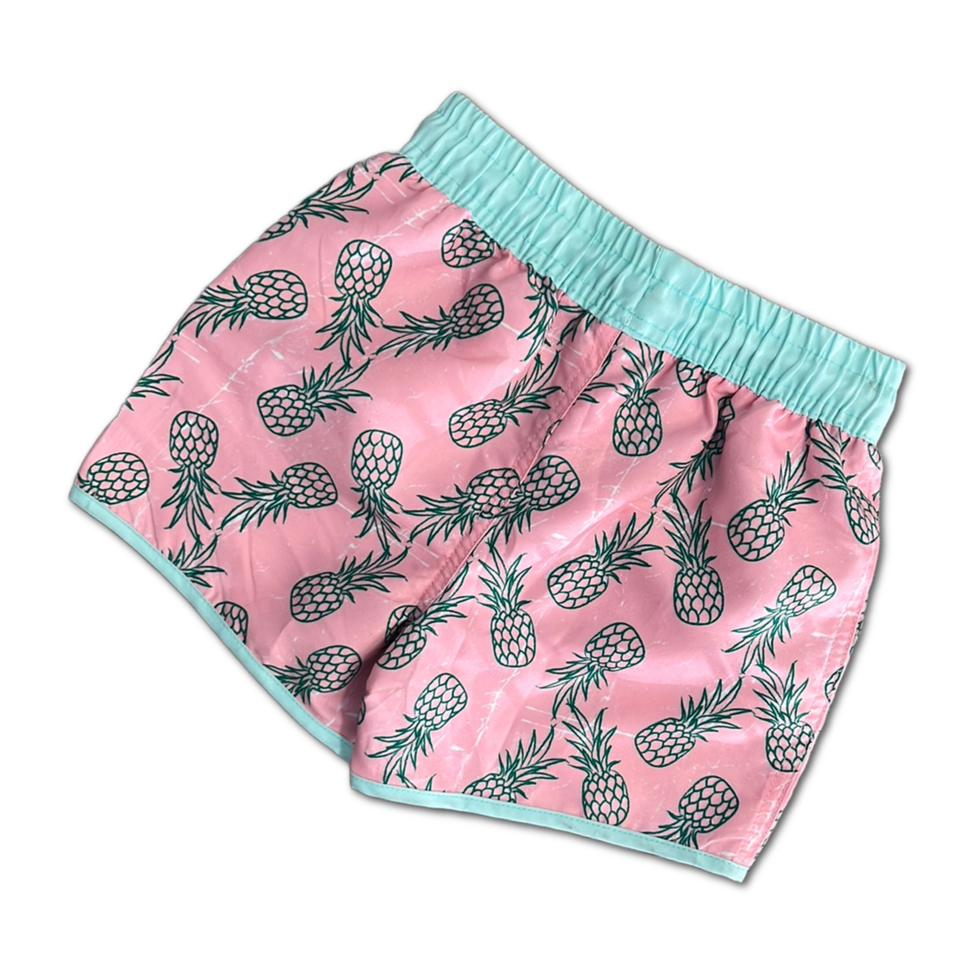 Make a splash this summer in these vibrant pink boardshorts featuring a bold green pineapple print that screams tropical vibes. The matching teal elastic waistband with drawstring and coordinating trim at the legs create a cohesive, retro-inspired look that's perfect for beach days and poolside hangouts. Whether you're catching waves or soaking up the sun, these shorts bring instant fun and personality to your warm-weather wardrobe. Youth SIZE only