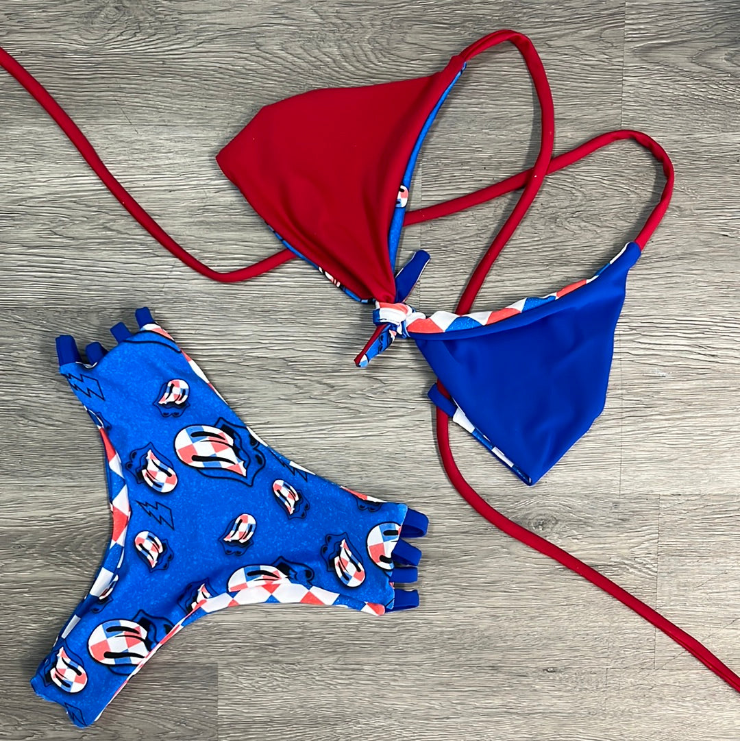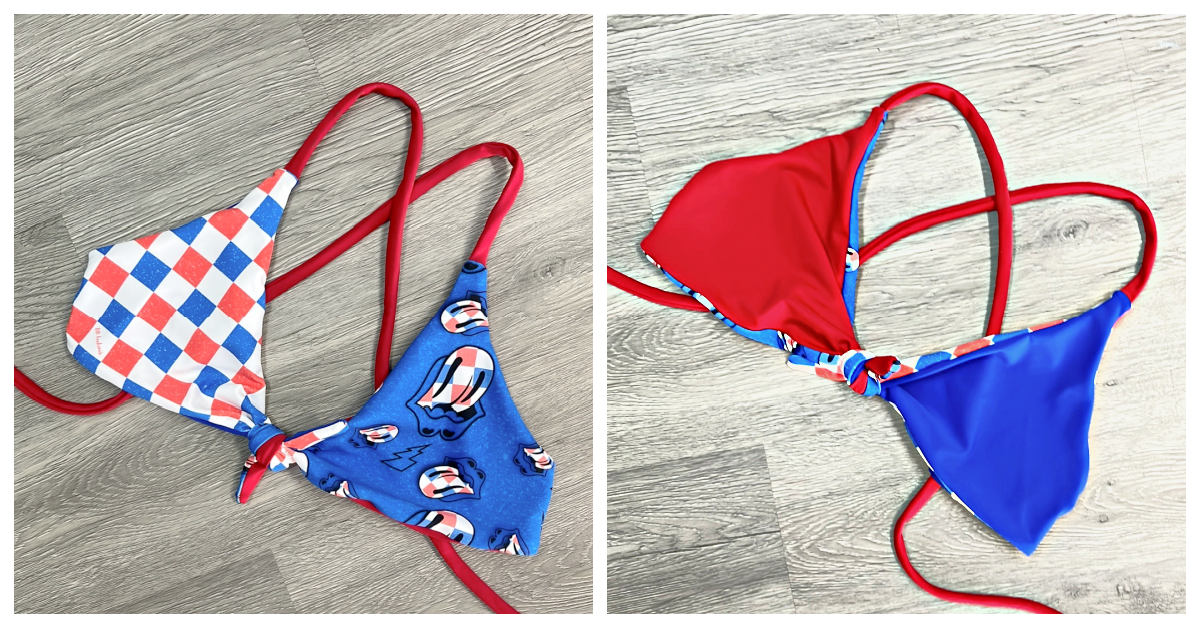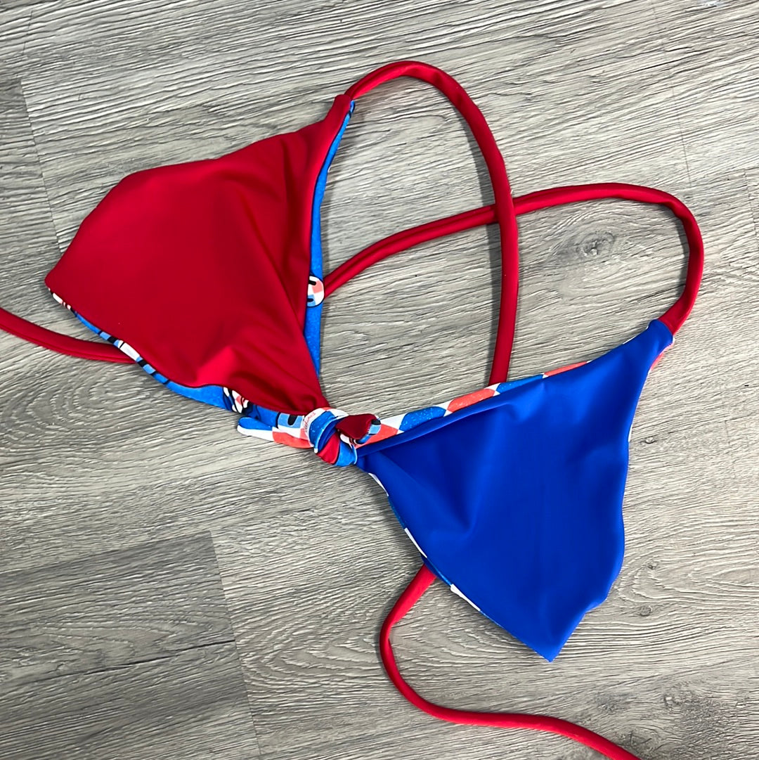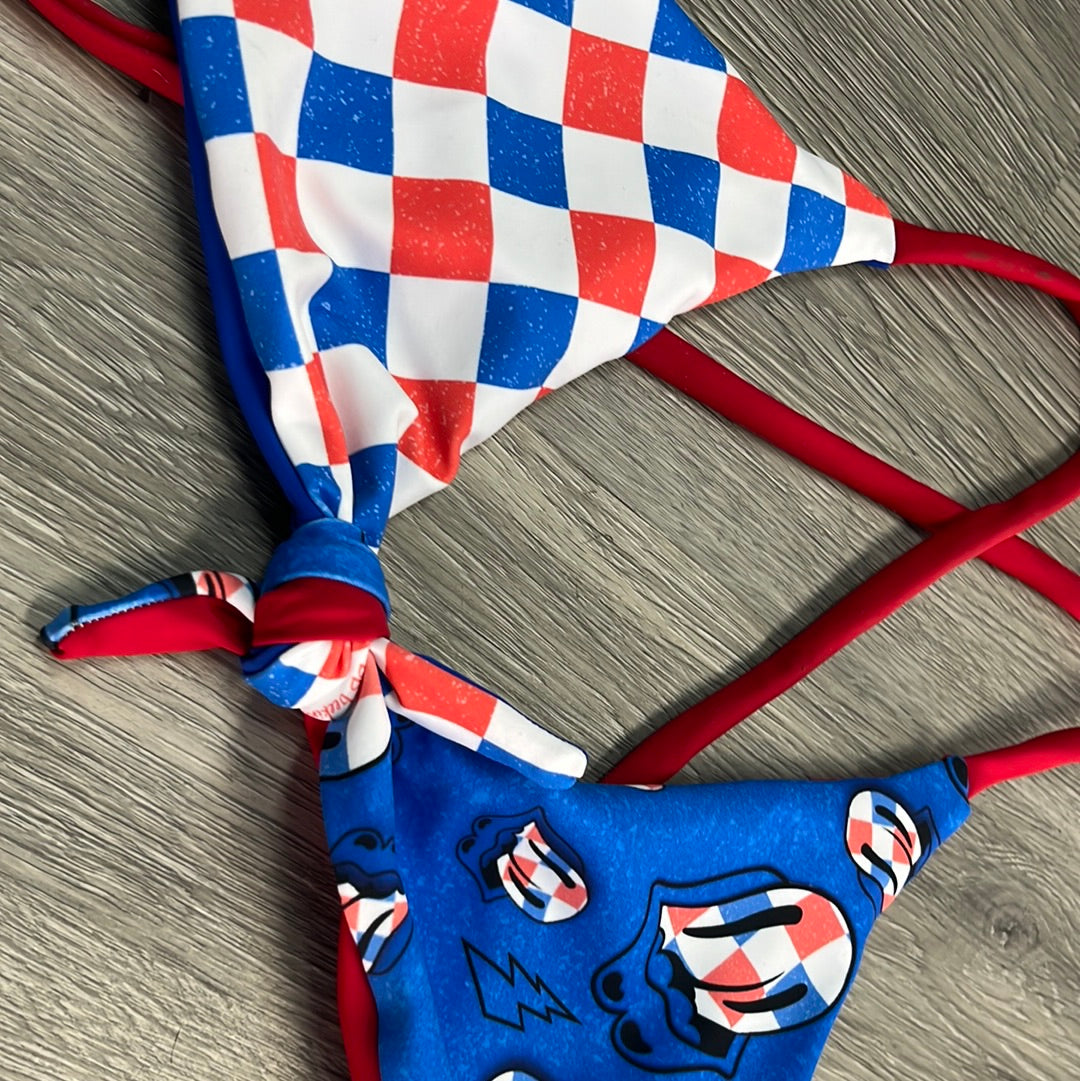 Live life to the fullest, even when you're looking for your next adventure! Rockin' USA Whis-key River top is designed with a fun Rock N Roll inspired design and checkered Patriotic design on one side and reverses to a solid blue and red. This top is perfect for any summer adventure and will keep you feeling cool all summer long!