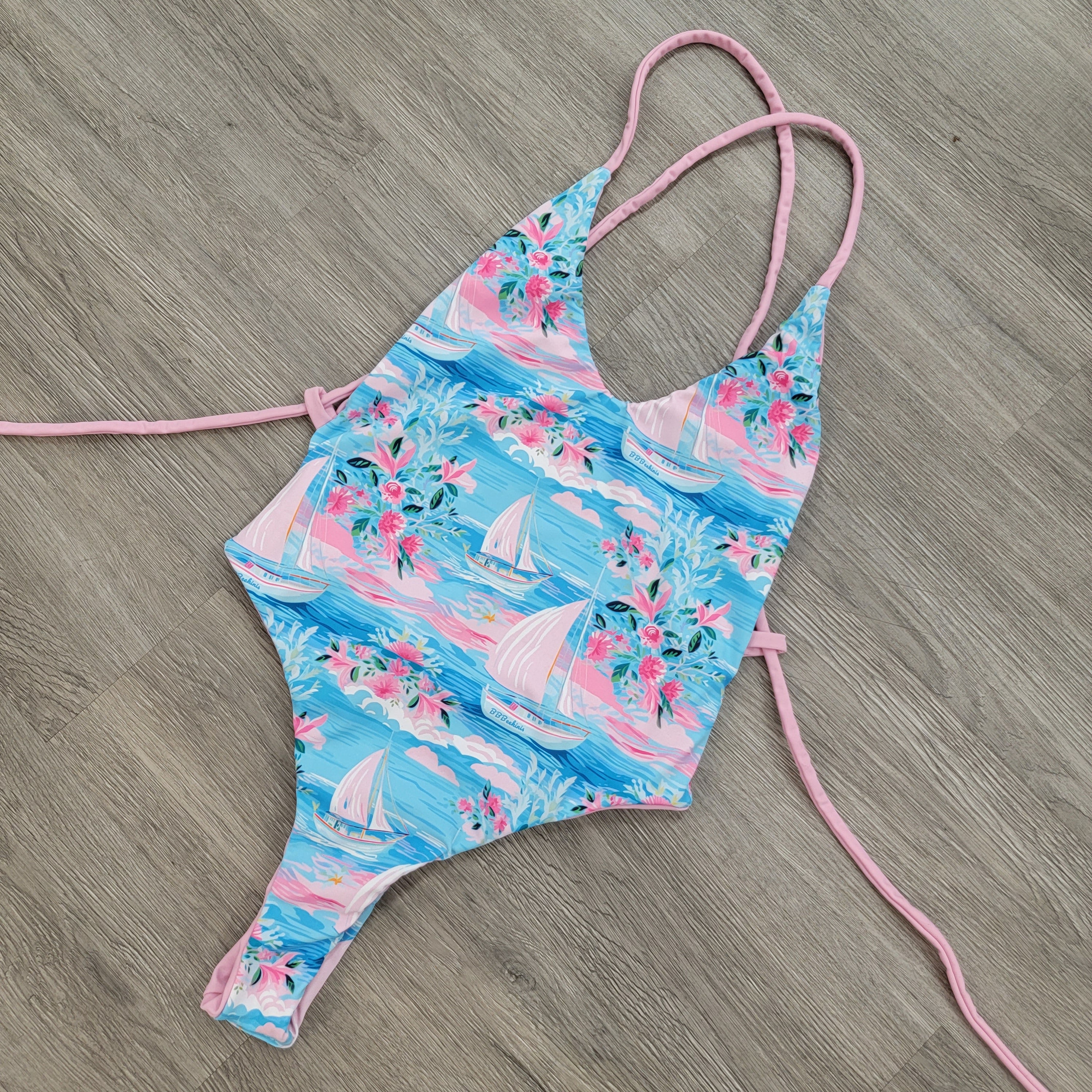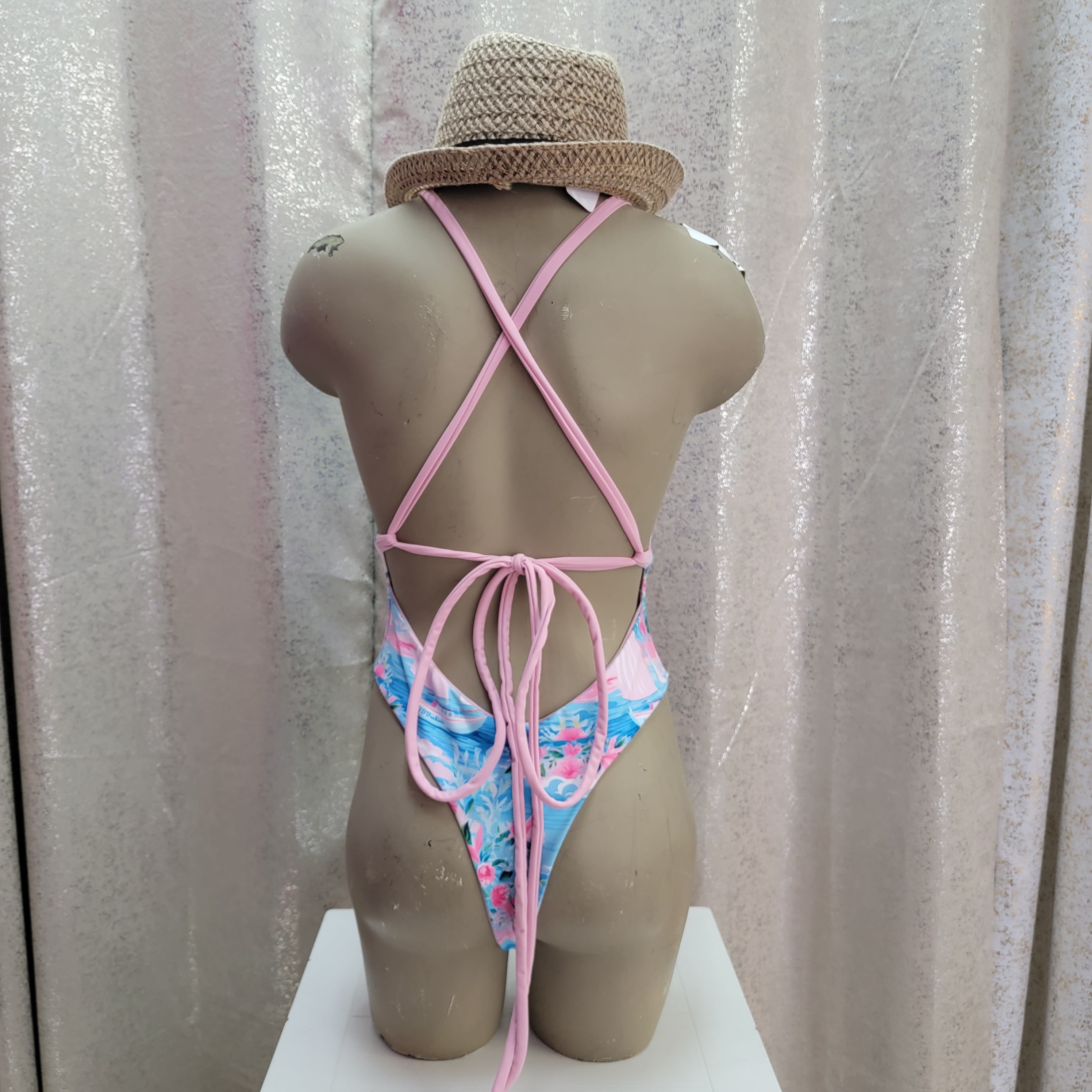 Hit the beach in style with this pink-reversible, strappy, thong one piece! It's as cheeky and sexy as you can get while still keeping it classy. Sail away on sun-soaked days in the perfect swimsuit.
