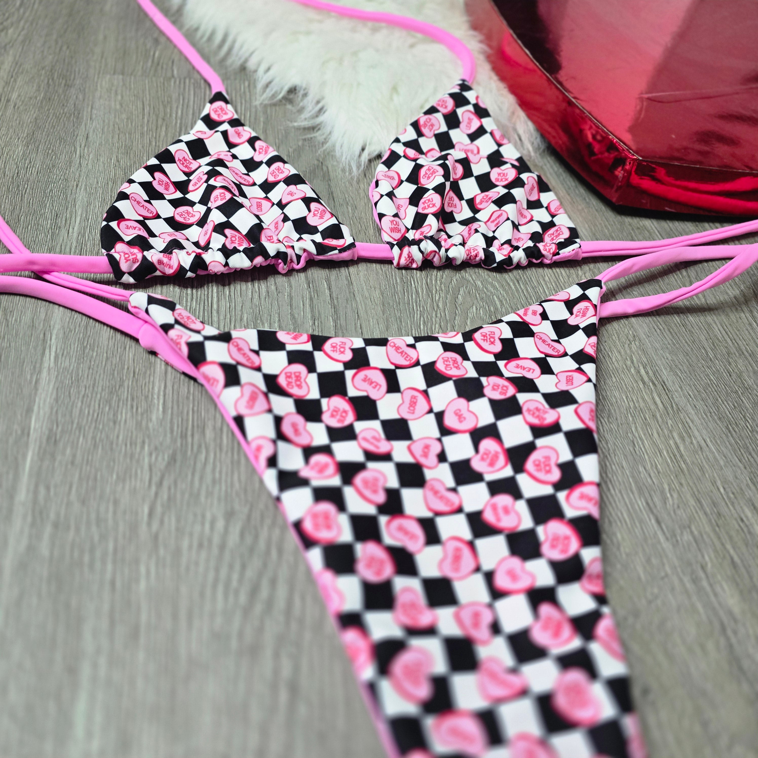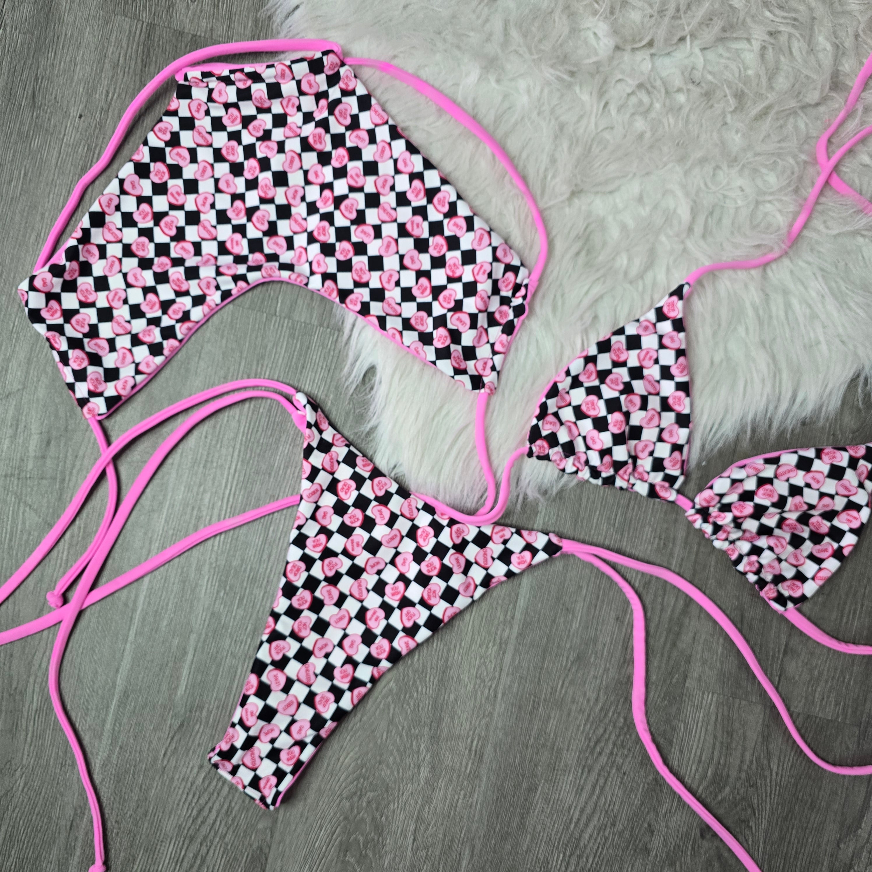 Transform into a fearless Single Babe with our Single AF Bali Bottom! Featuring checkered Valentines-inspired sayings and a reversible design to a pale pink, this piece amps up your confidence. Tie the hip sides and flaunt a cheeky back for added edge. Rise to the challenge and make a bold statement with this daring piece.
