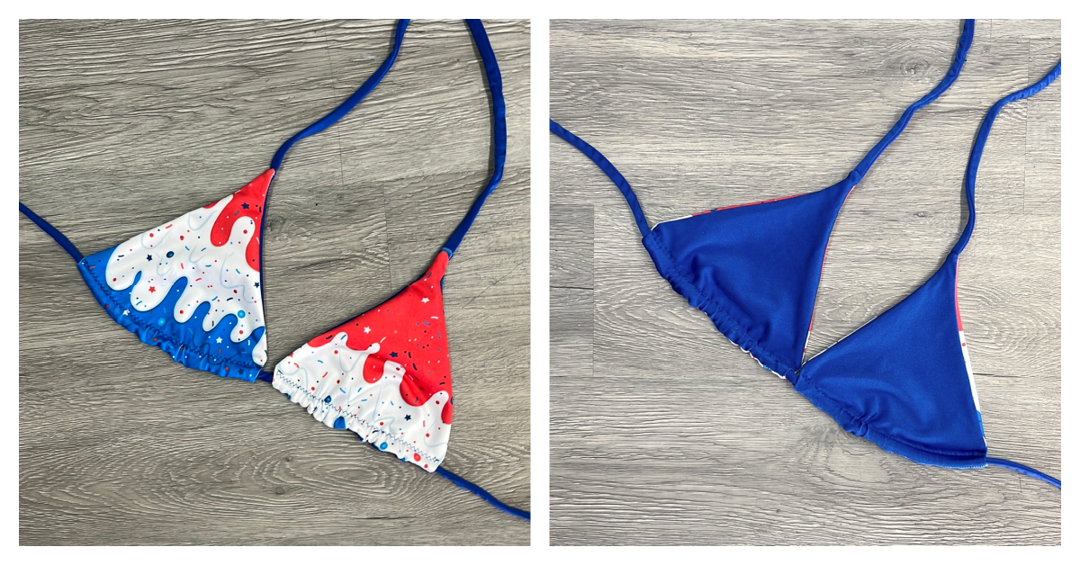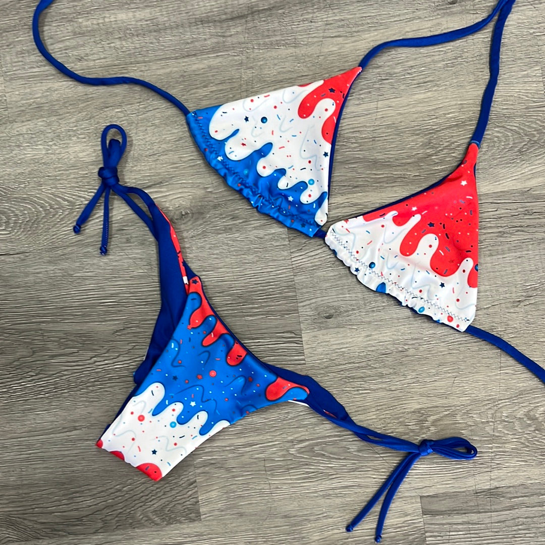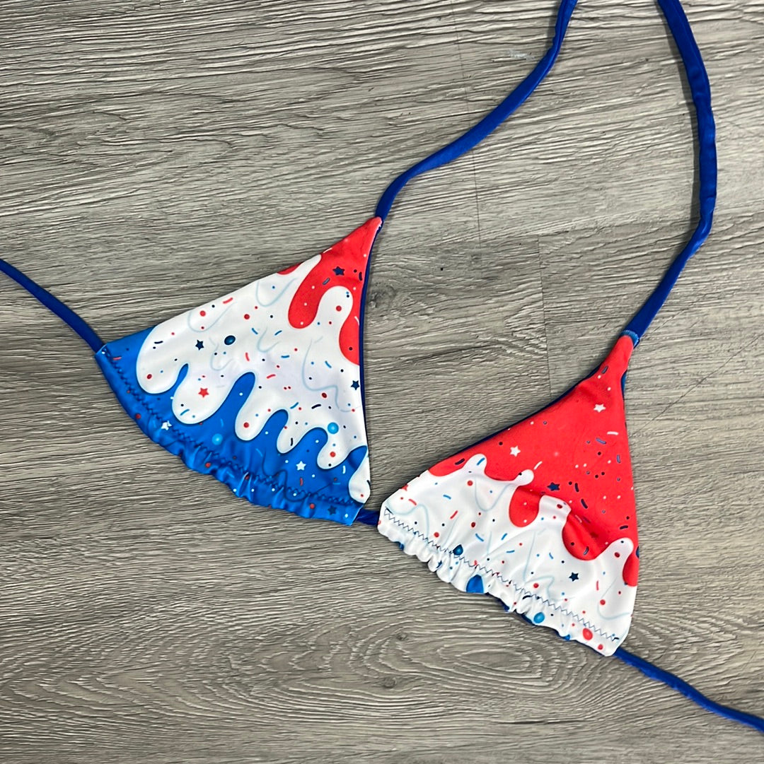 Feel as cool as a cone of ice cream in our Sugar Drip Top! The patriotic pattern of red, white, and blue drips and sprinkles will have you channeling your inner Uncle Sam. Plus, flip it inside out and you'll get a solid blue for two looks in one. Yum! 🍦