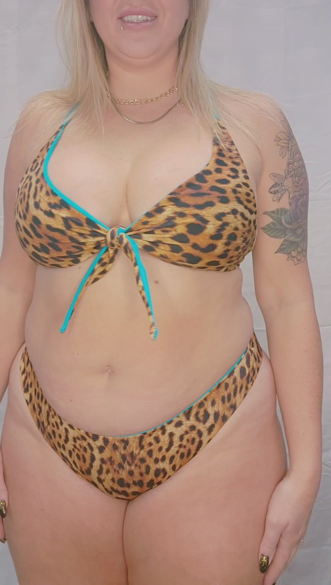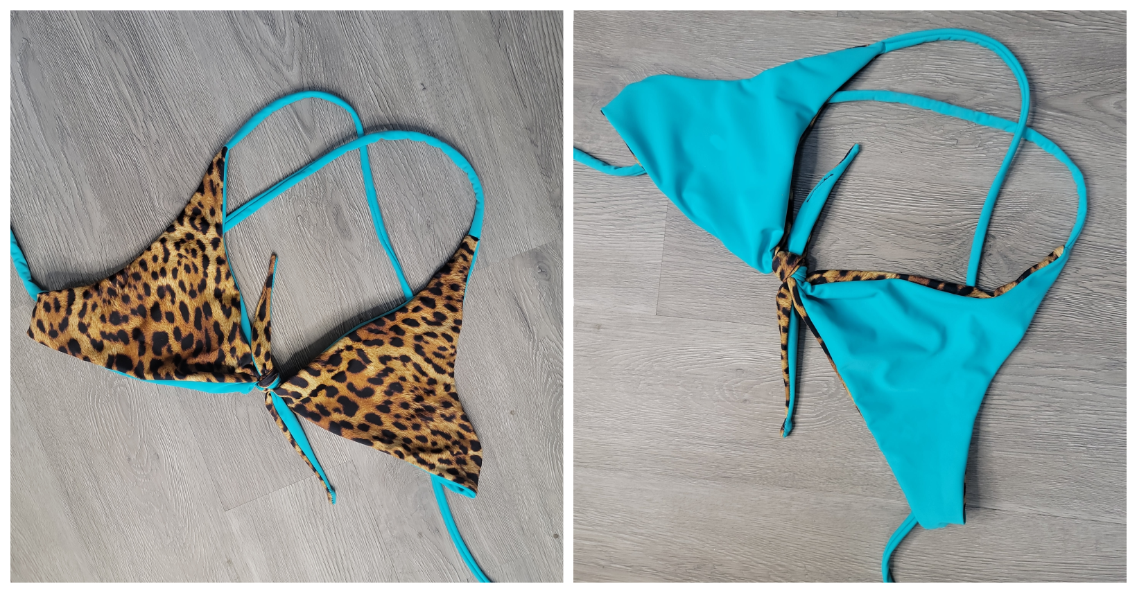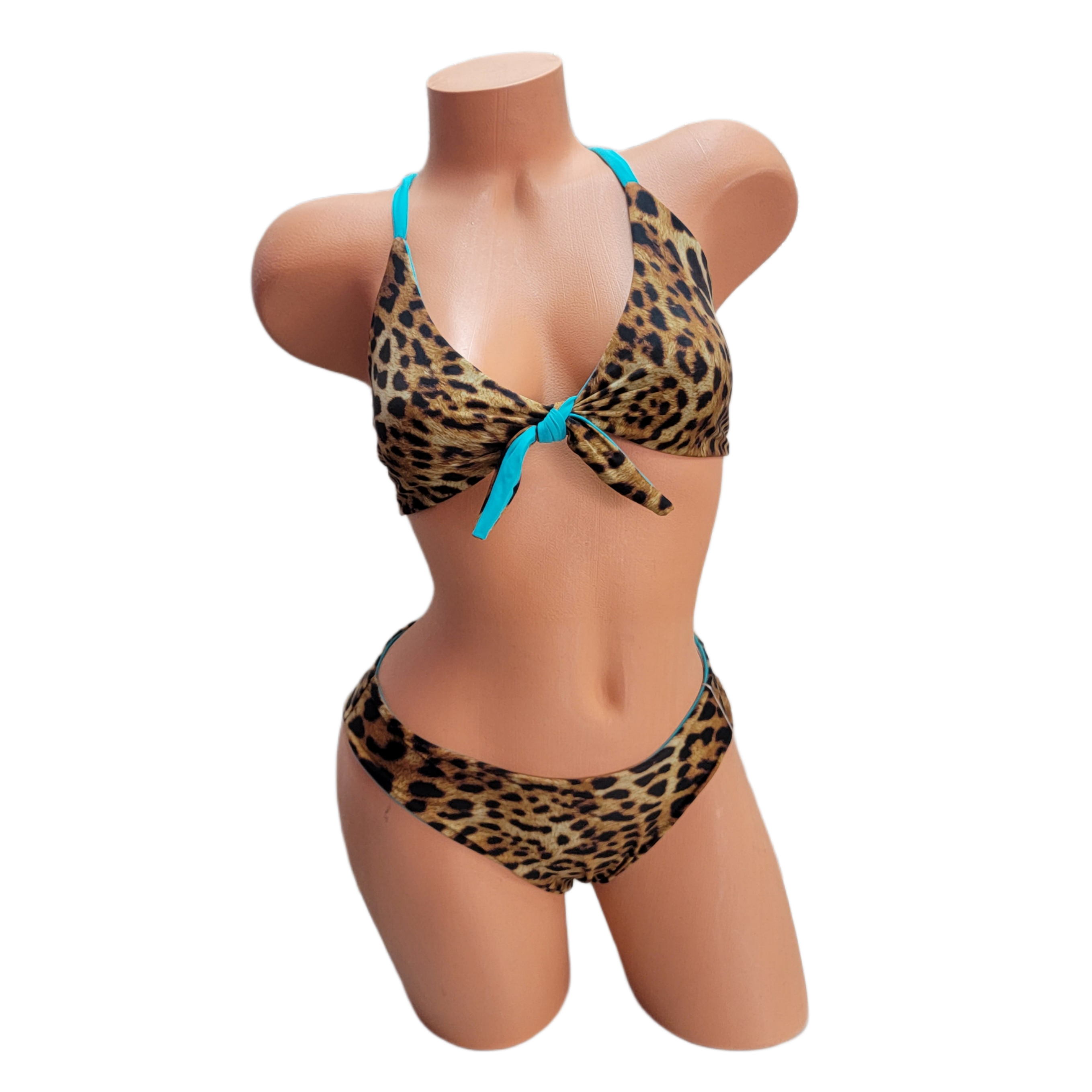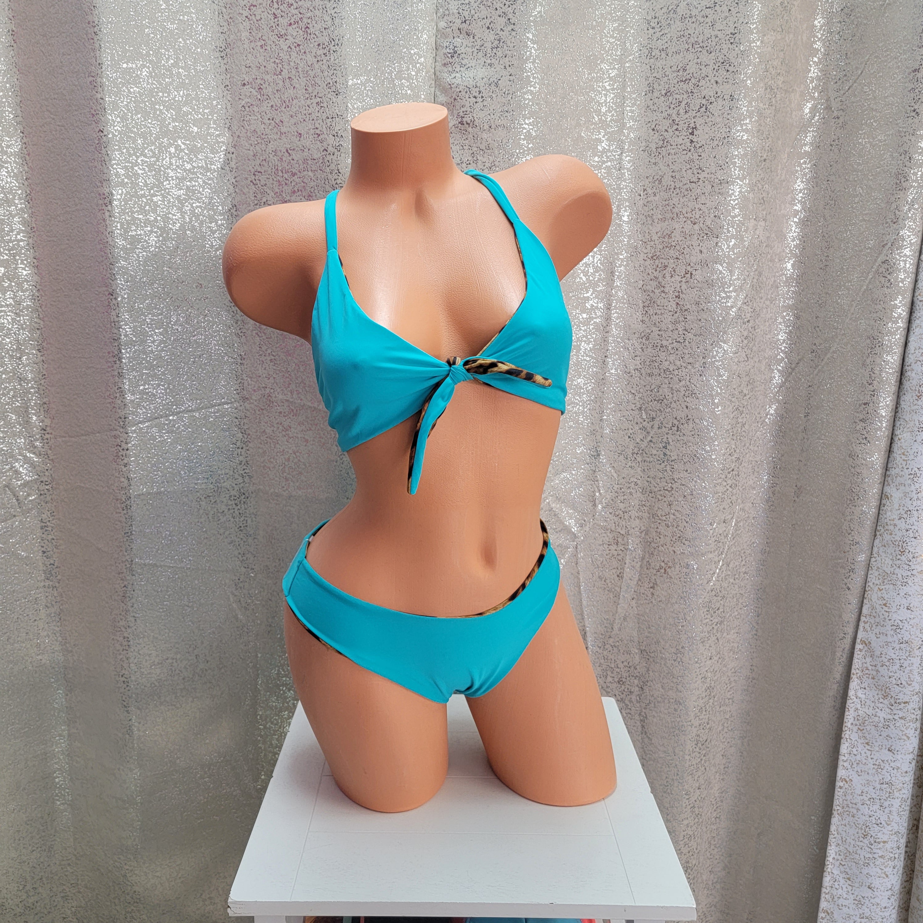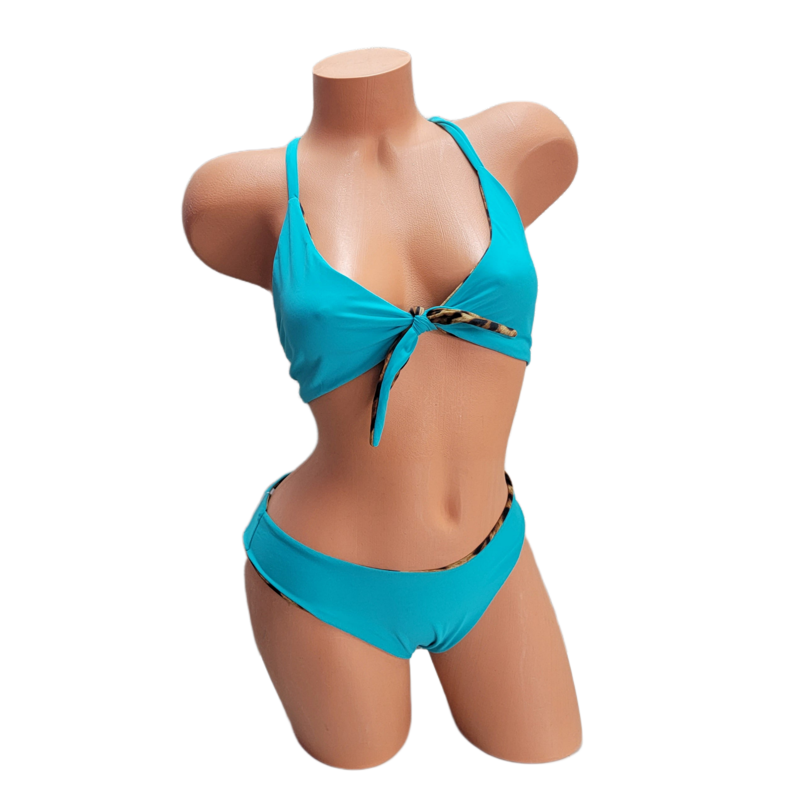 A versatile top that is both sporty and supportive. The beautiful tiffany blue reverses to a bold cheetah print.