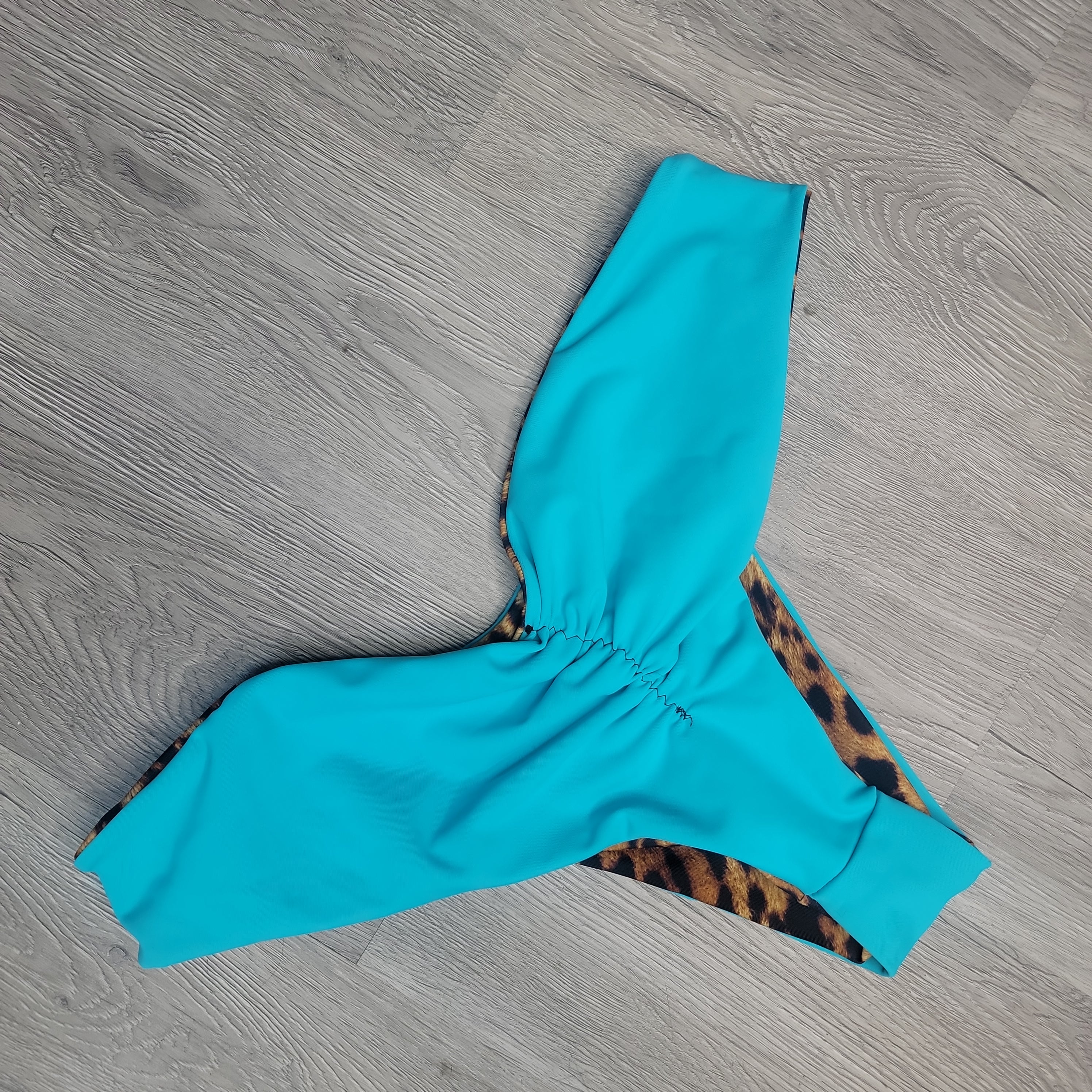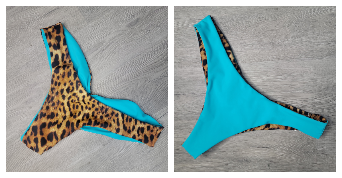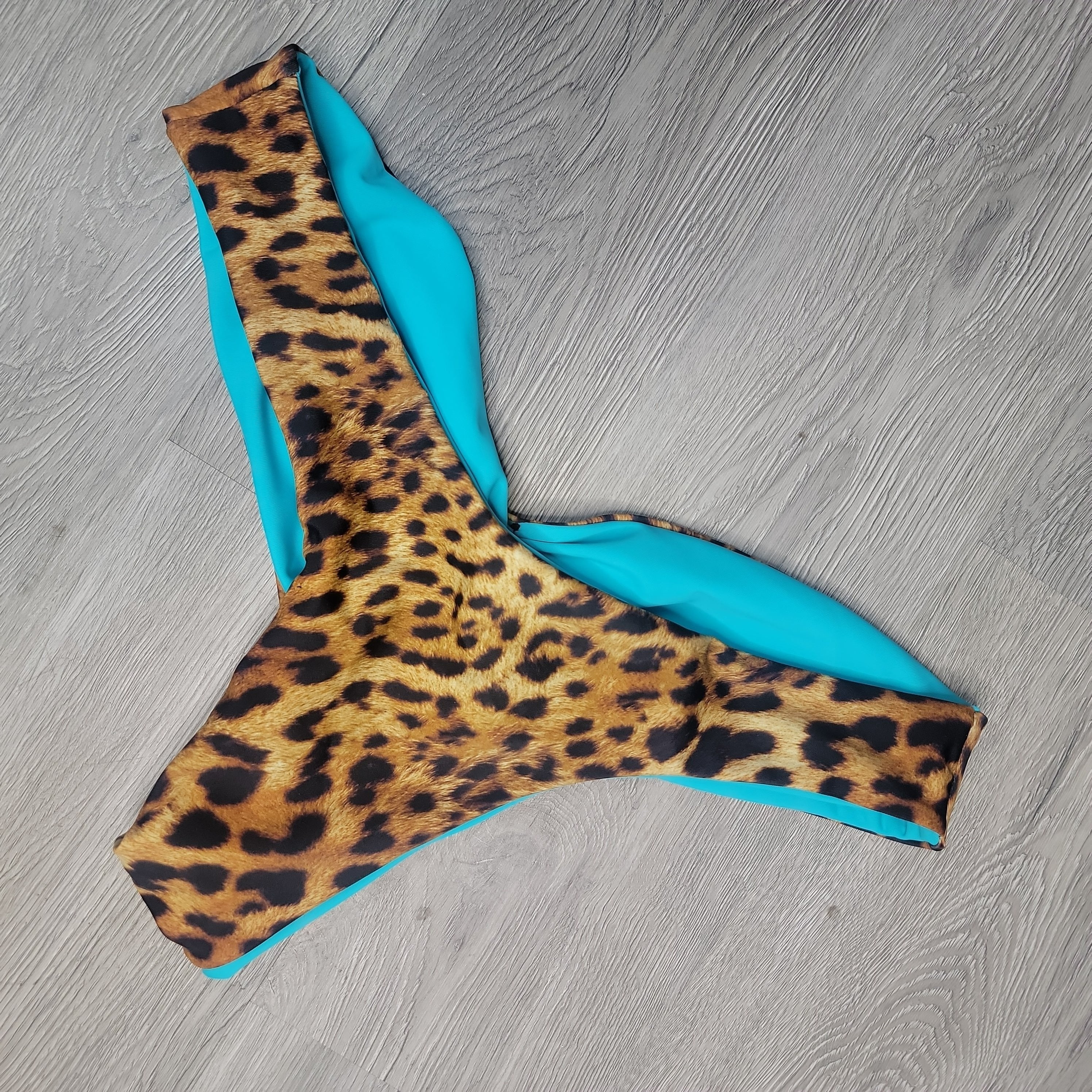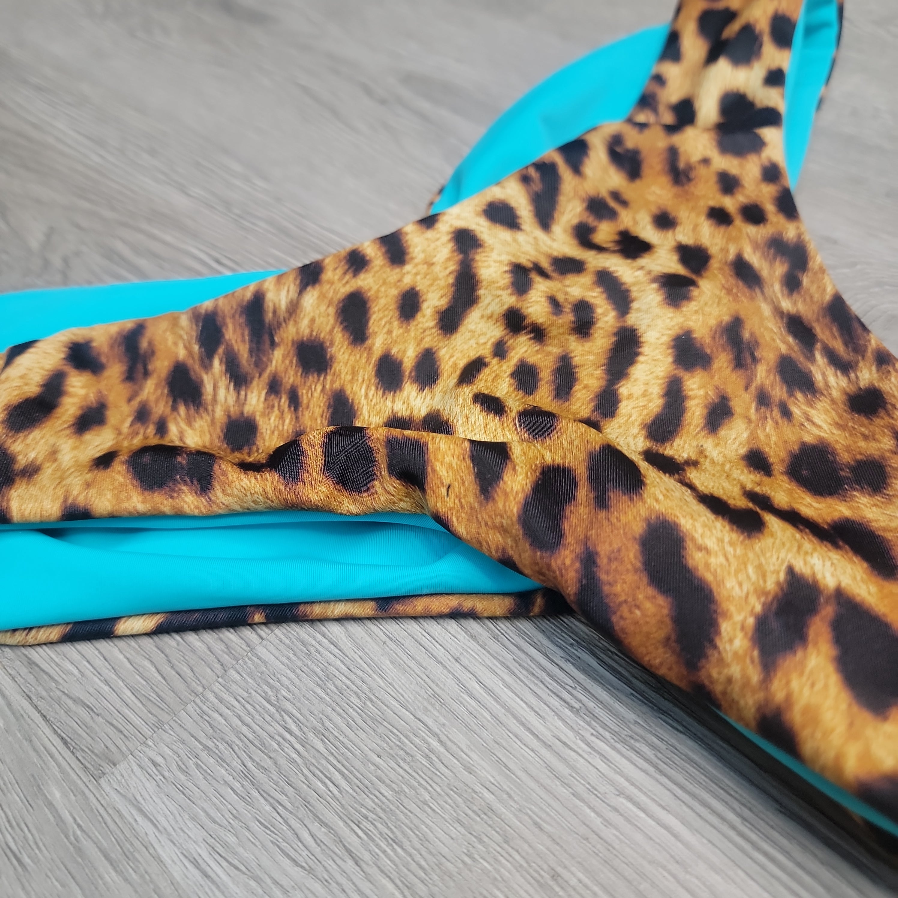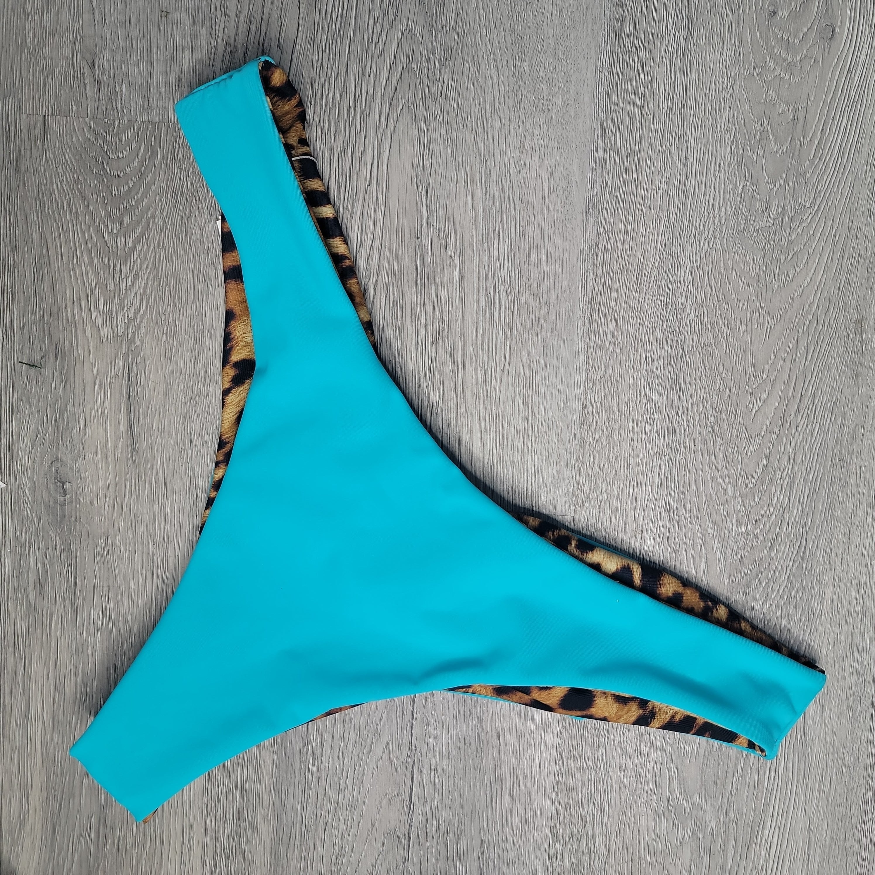 We are crazy about this style of bikini bottoms! Cheeky coverage with a cute scrunch butt! With a daring cheetah print on one side and reverses to a gorgeous tiffany blue!