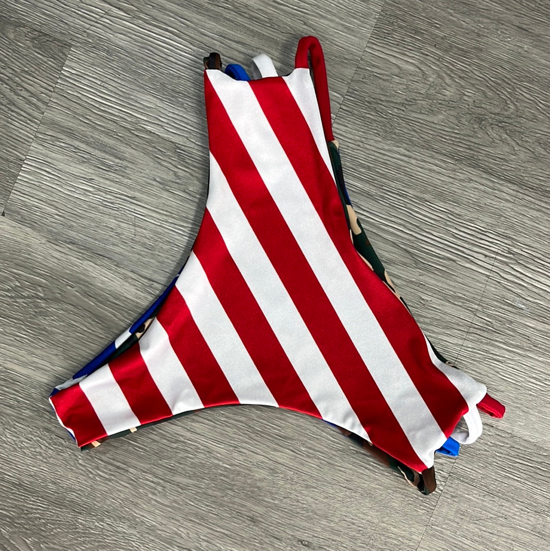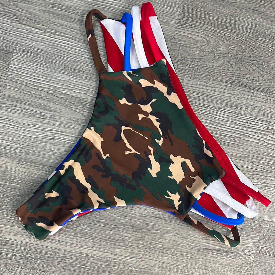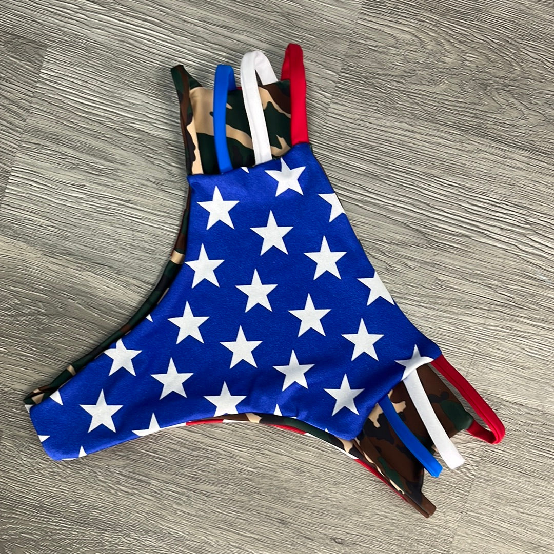 Go from camo to stars and stripes in one easy flip. These bottoms are cheeky, strappy, and reversible. True American, pure country!