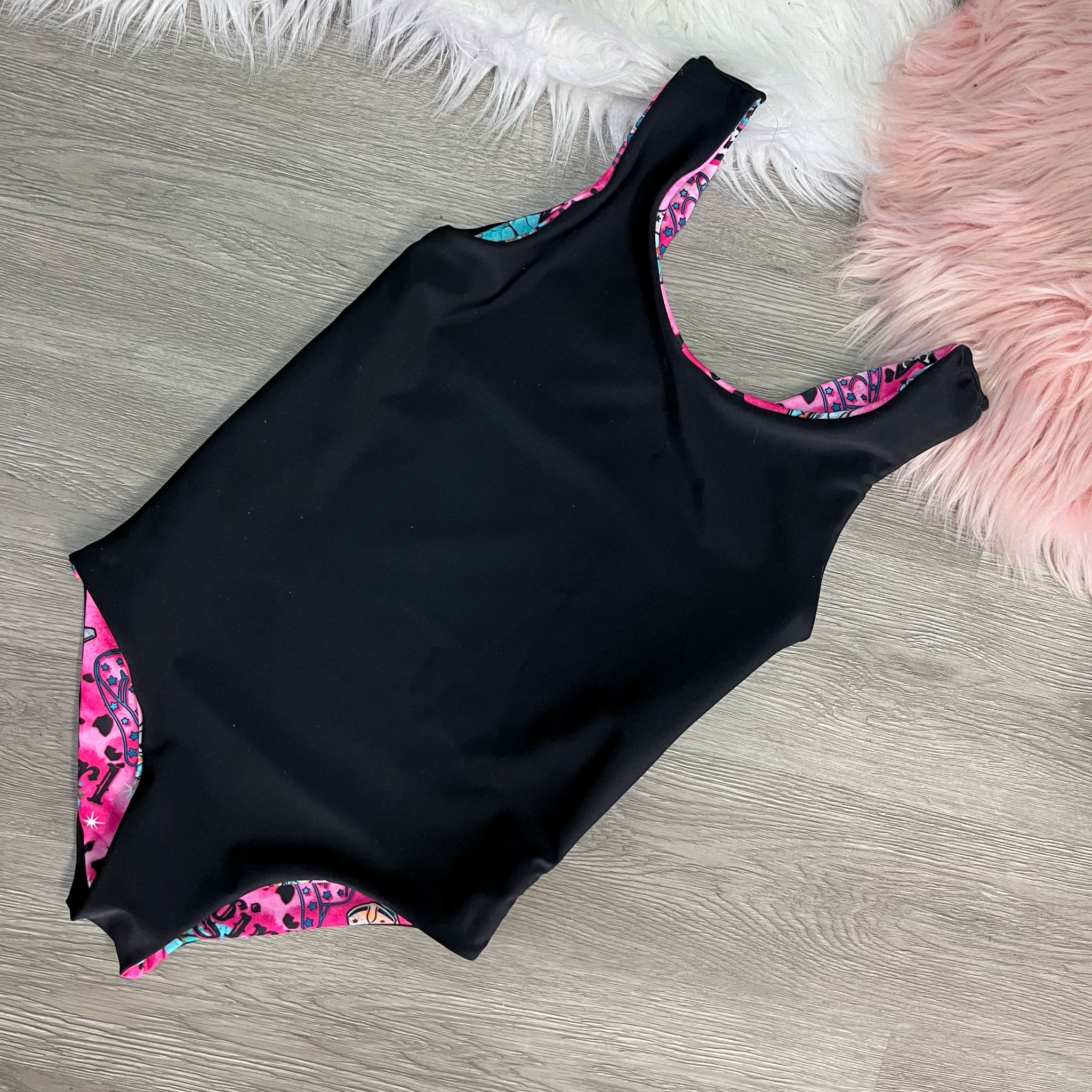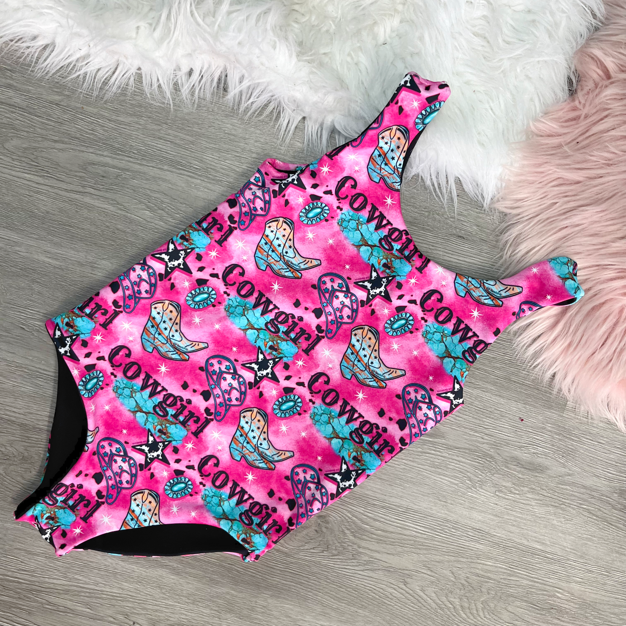 Your little cowgirl will be ready for adventures anytime with this one piece swimsuit. This suit features pink background accents with turquoise throughout, including the hat and boots. A great pattern for any occasion. Reversible to solid black.