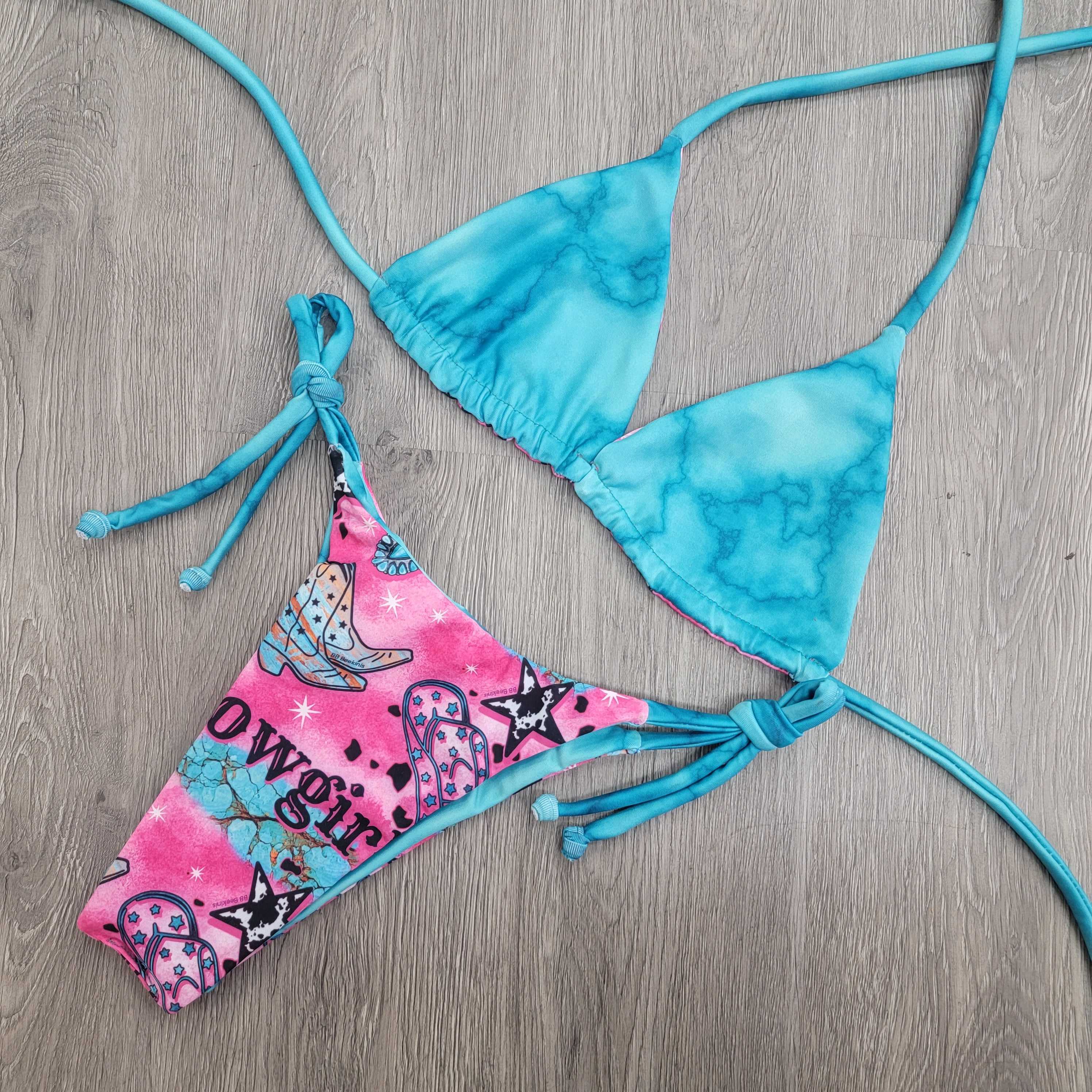 Cowgirl up with these Bali bottoms featuring adjustable tie sides that show off your cheeky side. In a playful twist, this pink country fabric reverses to bright turquoise, adding a fun pop of color to your beach look.